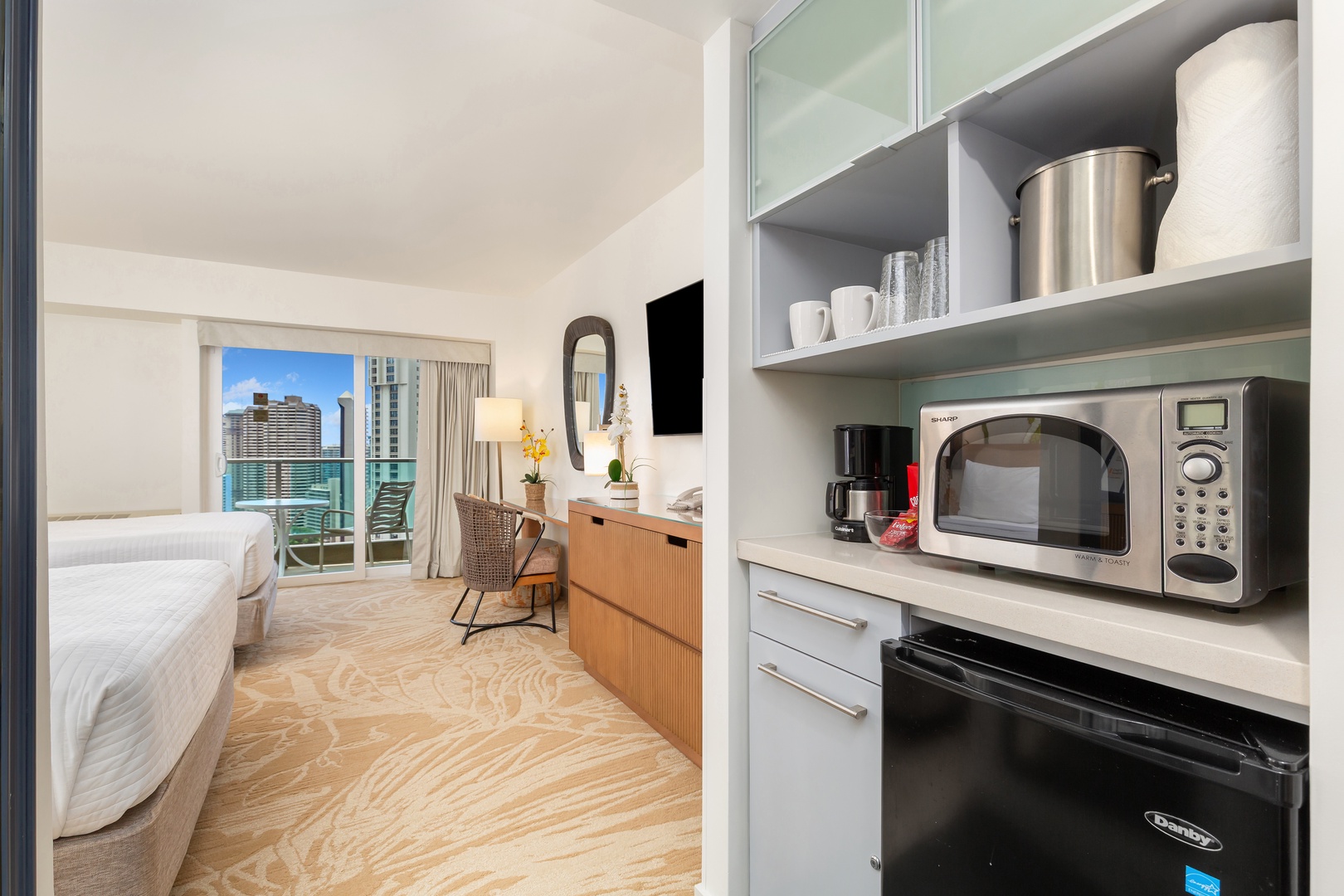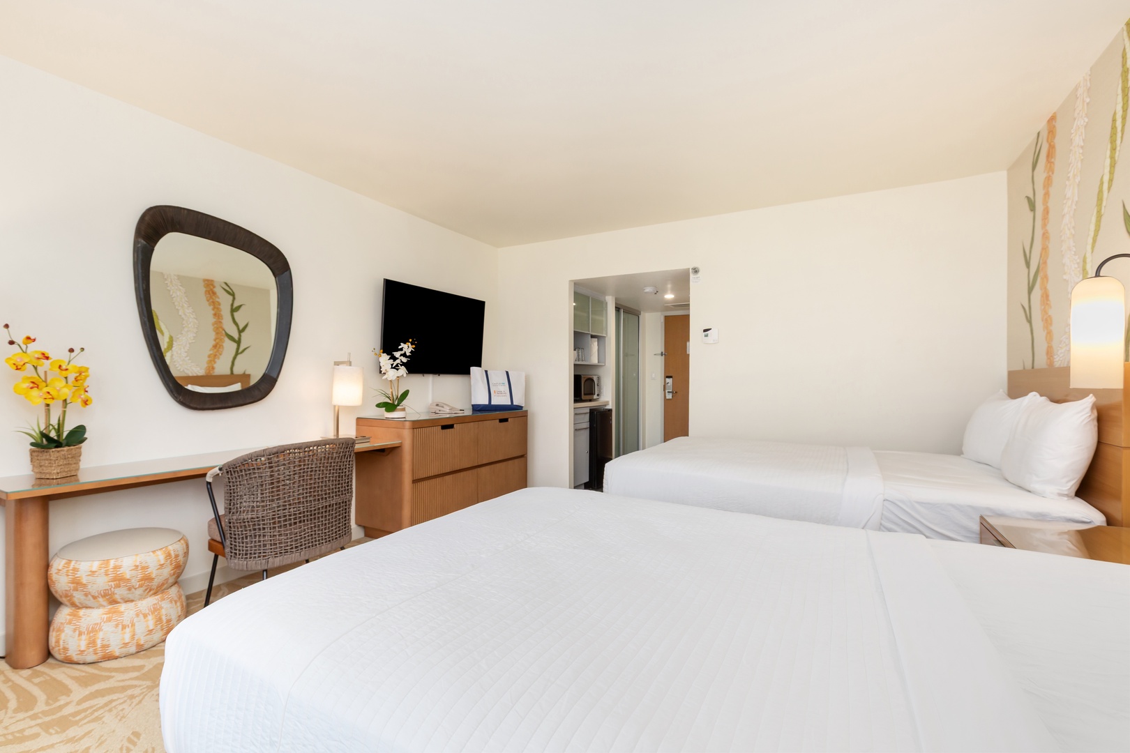 The living/sleeping area is furnished with a lounge chair, and a desk/workspace for all those business travelers. Plus, dresser space and comfortable two double beds with plush linens to ensure a peaceful rest. The area is equipped with a flat-screen TV and free Wi-Fi to keep you entertained after a day full of activities. The bathroom has a vanity and a full tub with a shower for winding down and rejuvenating. Warm-up leftovers or chill beverages in your kitchenette equipped with a mini-refrigerator, microwave, and coffee maker.
