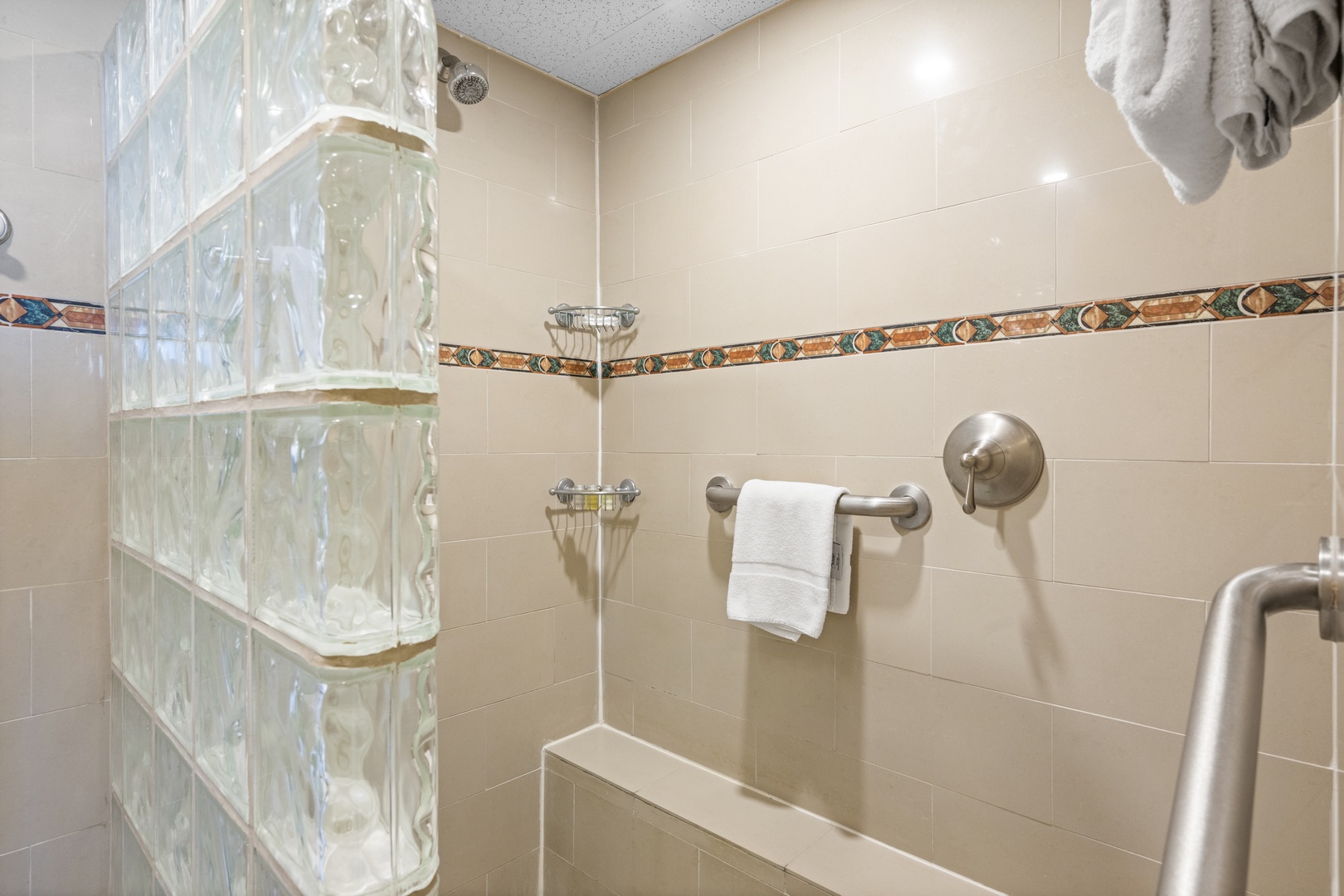 spacious walk-in shower with a glass block wall. The guest bedroom has