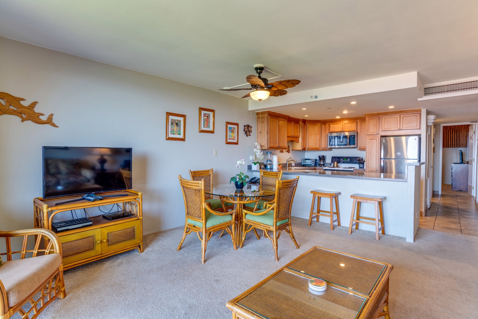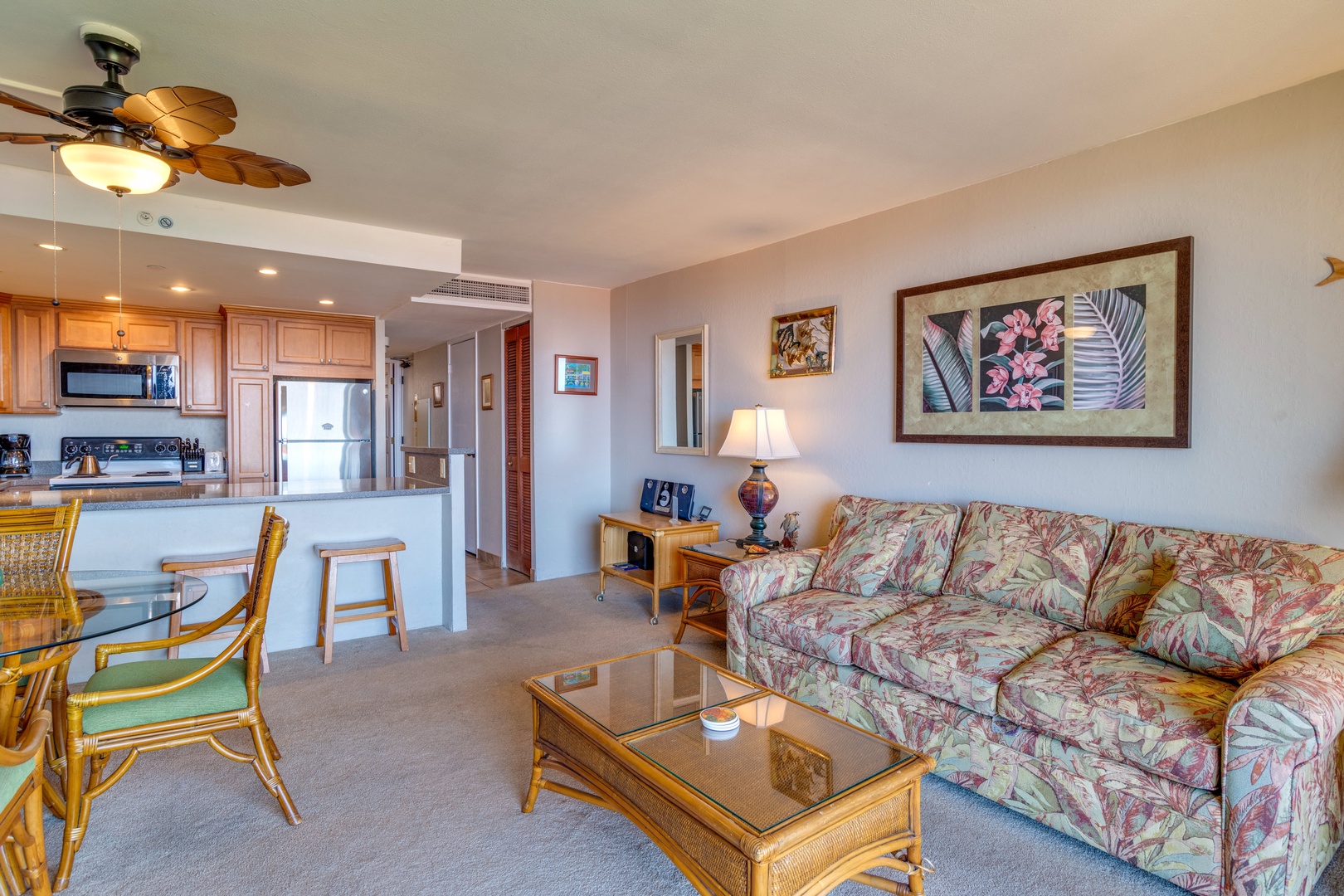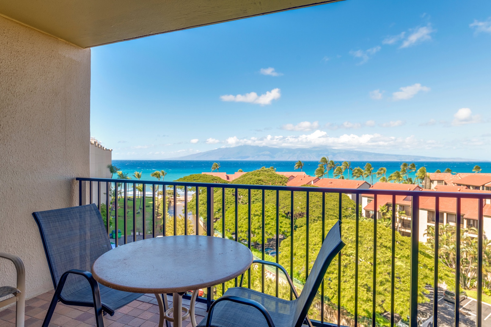Enjoy gorgeous views of the Kaanapali Coast and neighboring Molokai Island! This 717 square-foot vacation rental includes a spacious living room; spacious, private lanai, and an open-concept, fully equipped kitchen. Sleeps up to 4 with a queen bed in the master bedroom and queen sofa bed in the living room.