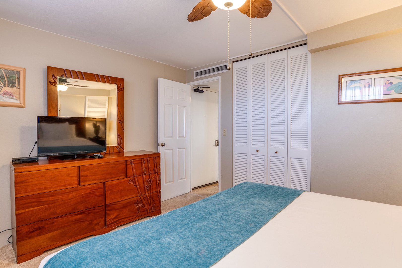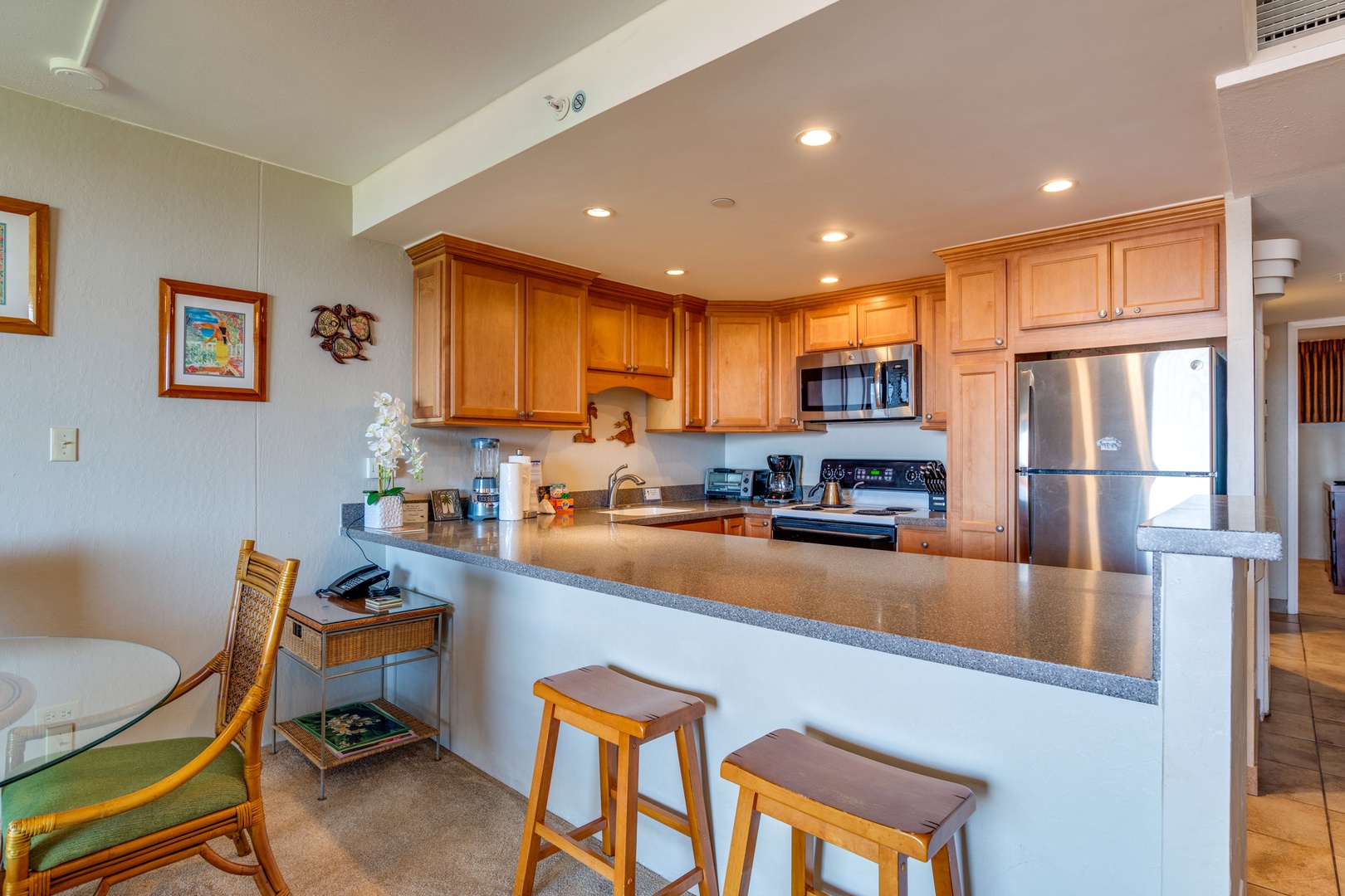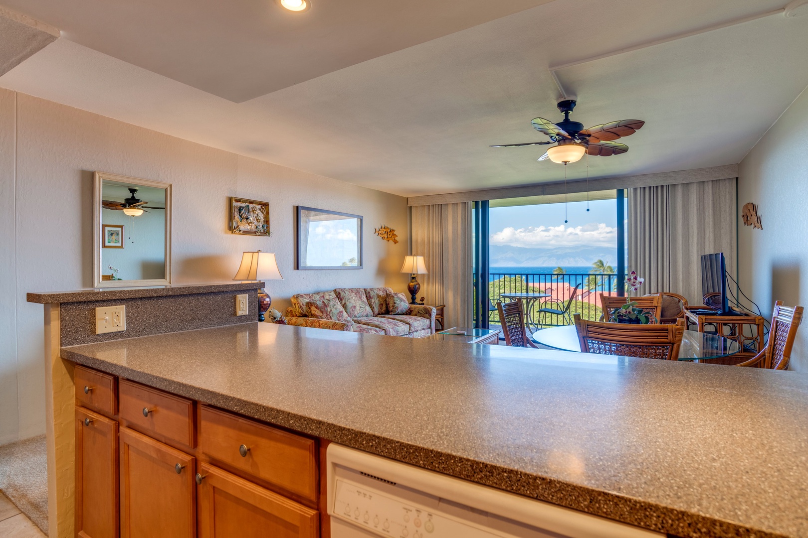 Enjoy gorgeous views of the Kaanapali Coast and neighboring Molokai Island! This 717 square-foot vacation rental includes a spacious living room; spacious, private lanai, and an open-concept, fully equipped kitchen. Sleeps up to 4 with a queen bed in the master bedroom and queen sofa bed in the living room.