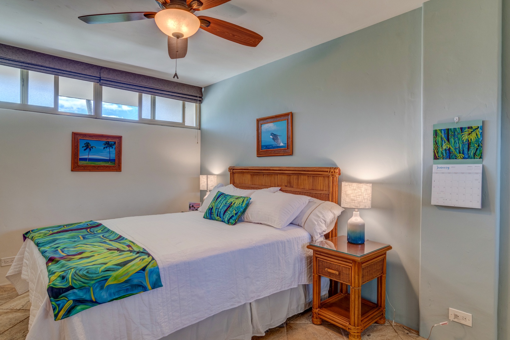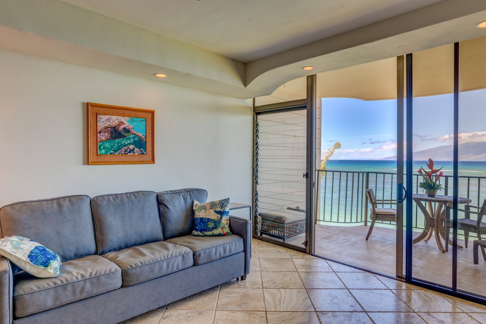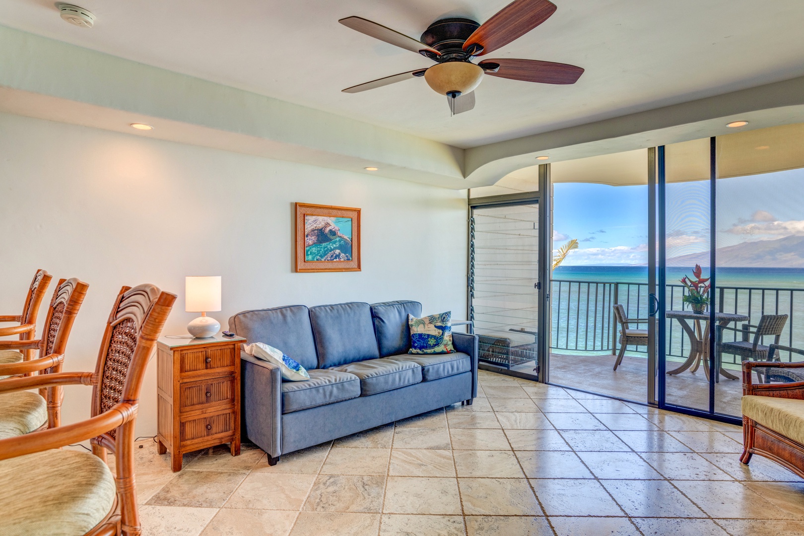 Condo Highlights: 1 bedroom and 1 bathroom sleeps up to 4 guests. There is a queen size bed in the bedroom and a sleeper sofa in the living room. There is AC in both the living room area and the bedroom of the condo and ceiling fans throughout. Spacious living area with comfortable furnishings and full ocean views.