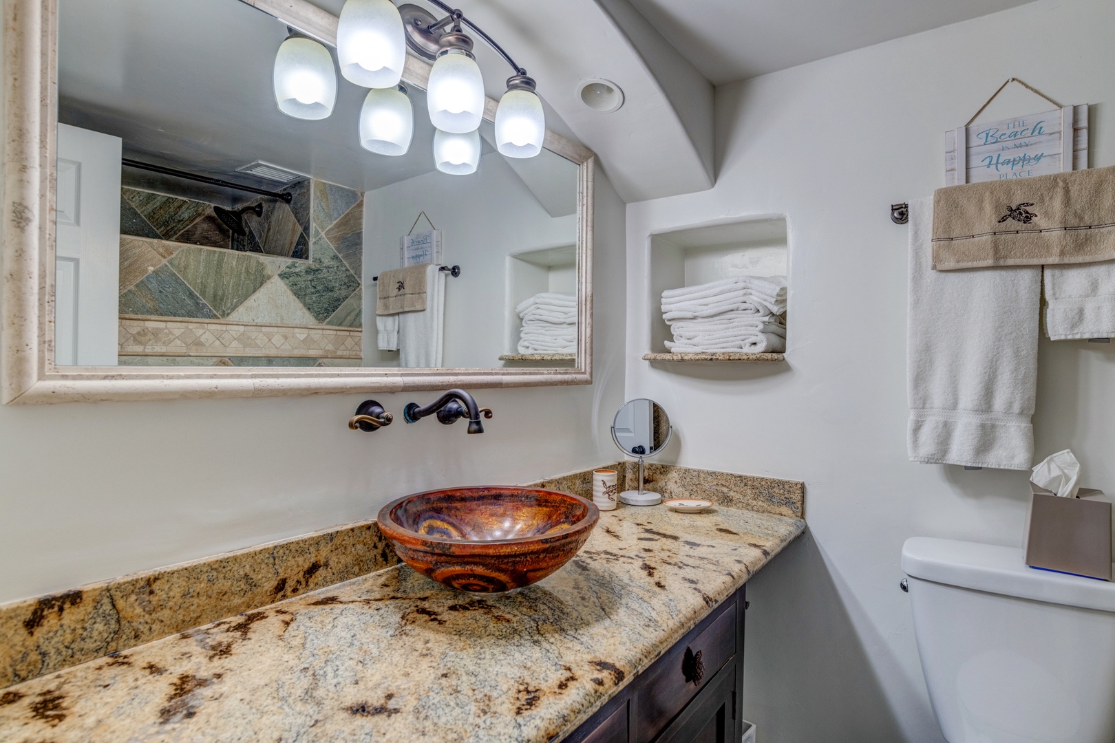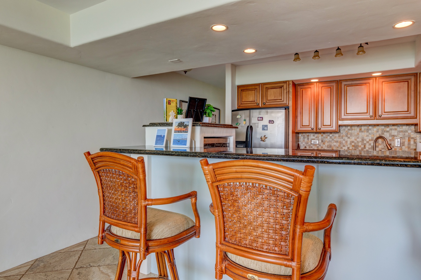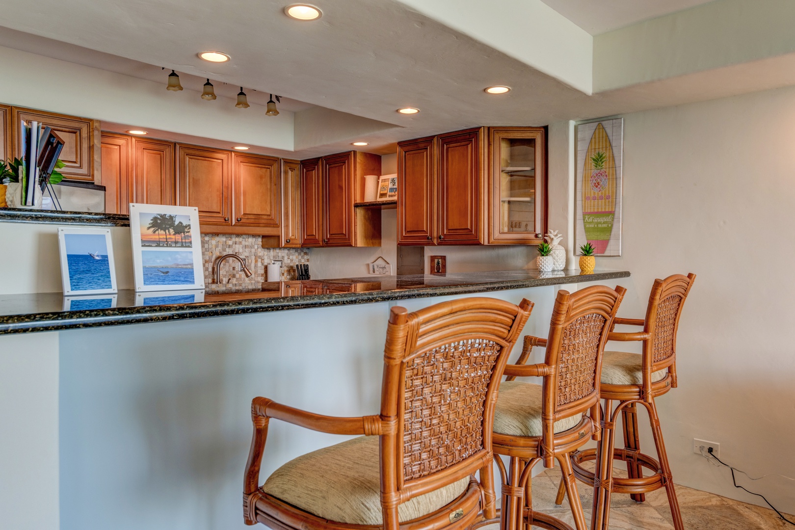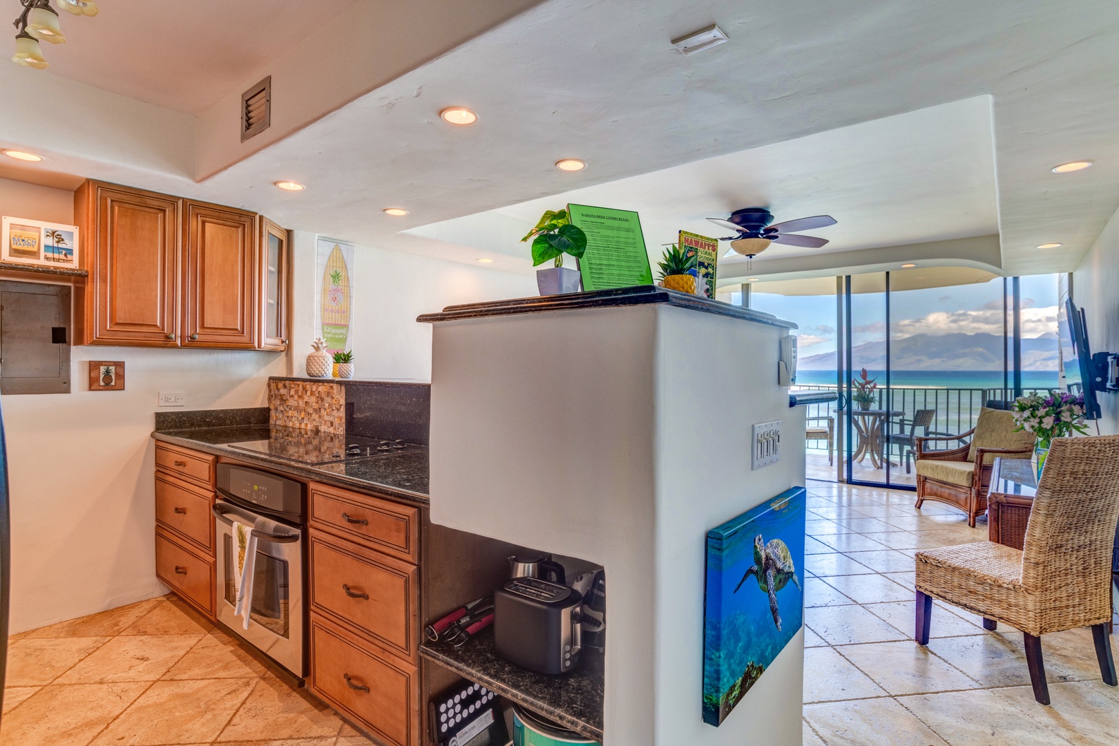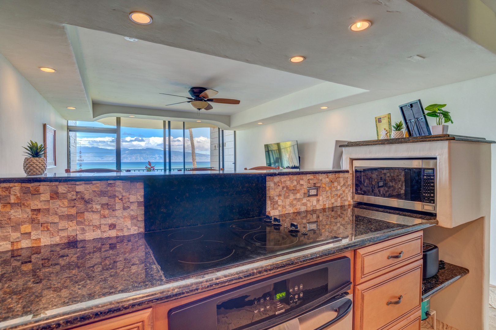 Prepare your masterchef meals in a kitchen with a view. This fully equipped kitchen comes with granite countertops & updated appliances and ocean views.