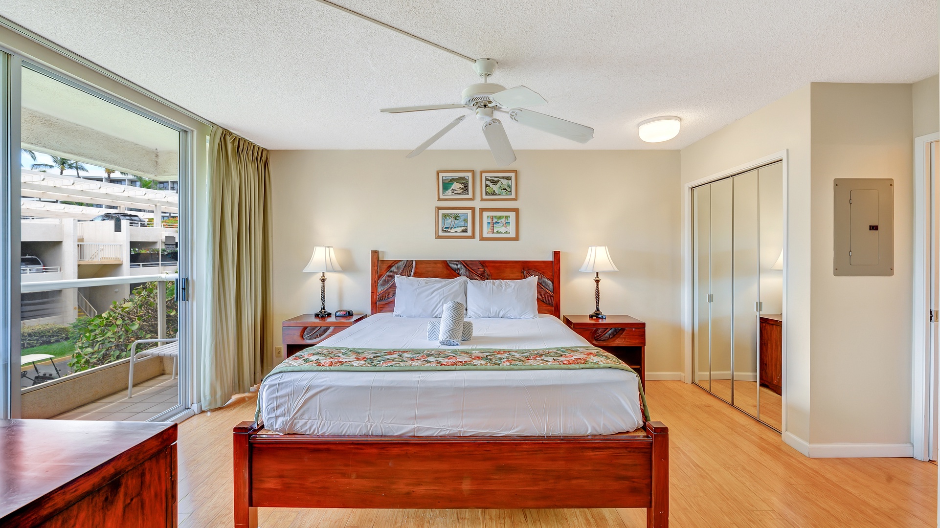 Share island fare at the etched teak-wood dining room table for four or on the private lanai that’s also the perfect al fresco spot for beginning the day with fruit smoothies or winding down after a day of exploring Maui’s bountiful Upcountry. The etched wood motif also flows into the bedroom with the headboard, end tables and dresser.