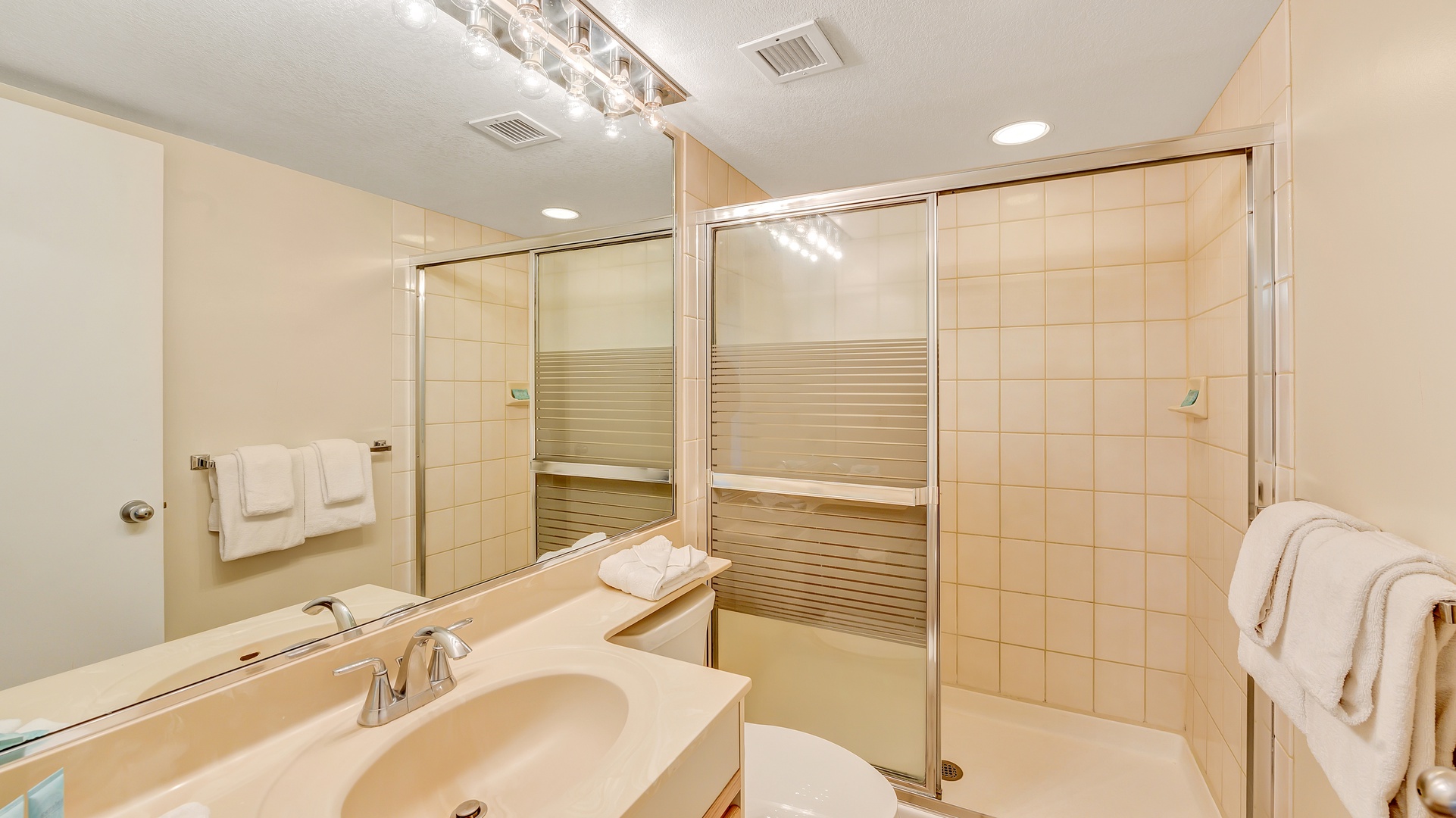Other suite perks include an in-unit washer/dryer, air conditioning, WiFi, flat screen TV, ceiling fans, clock radio, blow dryer, cool wood-like flooring, bathroom with walk-in shower, and second bathroom with soaking tub and upgraded lighting.