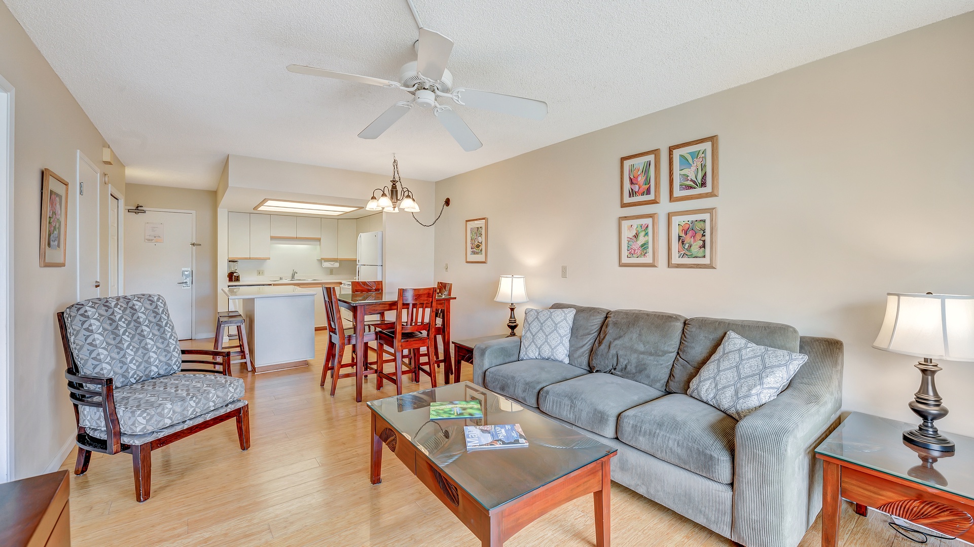 Floor-to-ceiling sliders allow South Maui’s scenery and sunshine to seamlessly flow into the living area and open-design kitchen equipped with breakfast bar seating two. Meal prep is a pleasure with the kitchen’s airy feel and appliances that include a refrigerator, microwave, dishwasher, stovetop, oven and coffeemaker.
