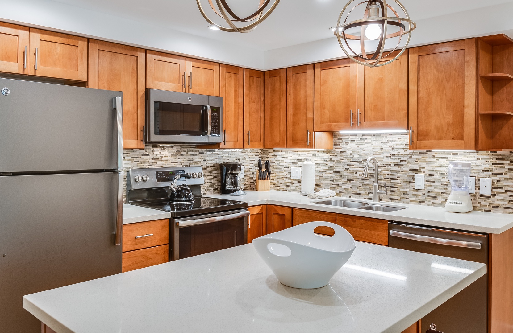 Stunning two-bedroom garden view with modern amenities to make you feel right at home. There's nothing like a home-cooked meal, and this kitchen is welcoming! It has a warm backsplash and kitchen island which will meet all of your meal preparation needs. The kitchen is fully stocked with stainless steel appliances including a fridge, microwave, dishwasher, blender, and coffee pot.
