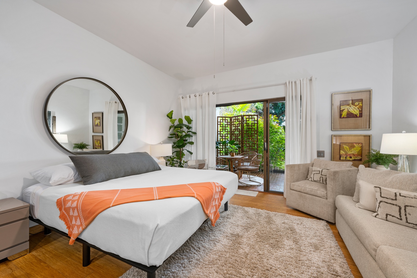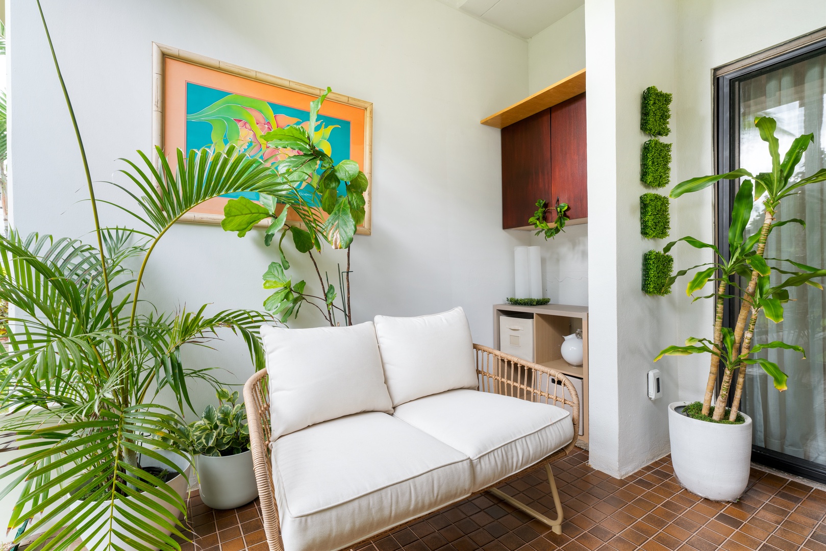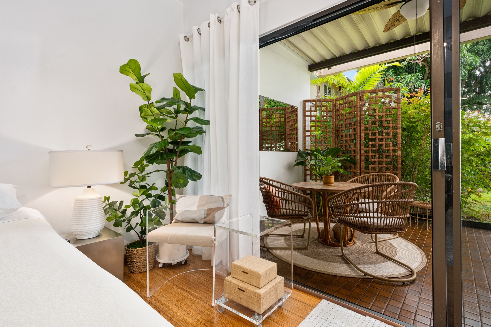For outdoor drinks and dining, the tiled lanai has a table and three chairs, or guests can enjoy the couch surrounded by tropical plants. Here guests can plan the day with a morning coffee or wind down with sunset beverages.