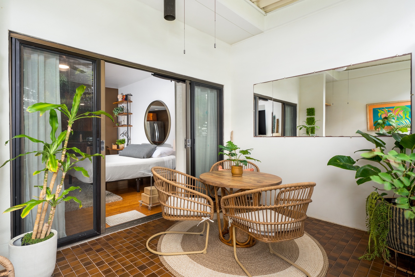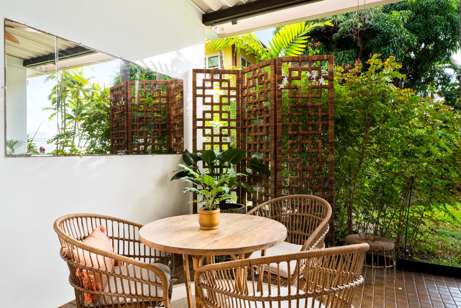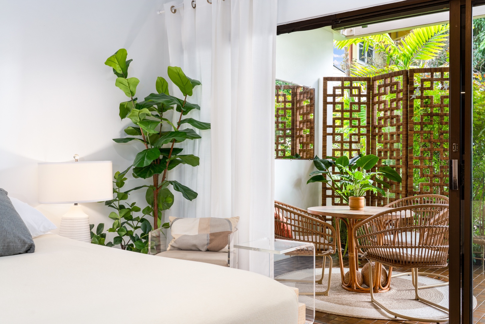 For outdoor drinks and dining, the tiled lanai has a table and three chairs, or guests can enjoy the couch surrounded by tropical plants. Here guests can plan the day with a morning coffee or wind down with sunset beverages.