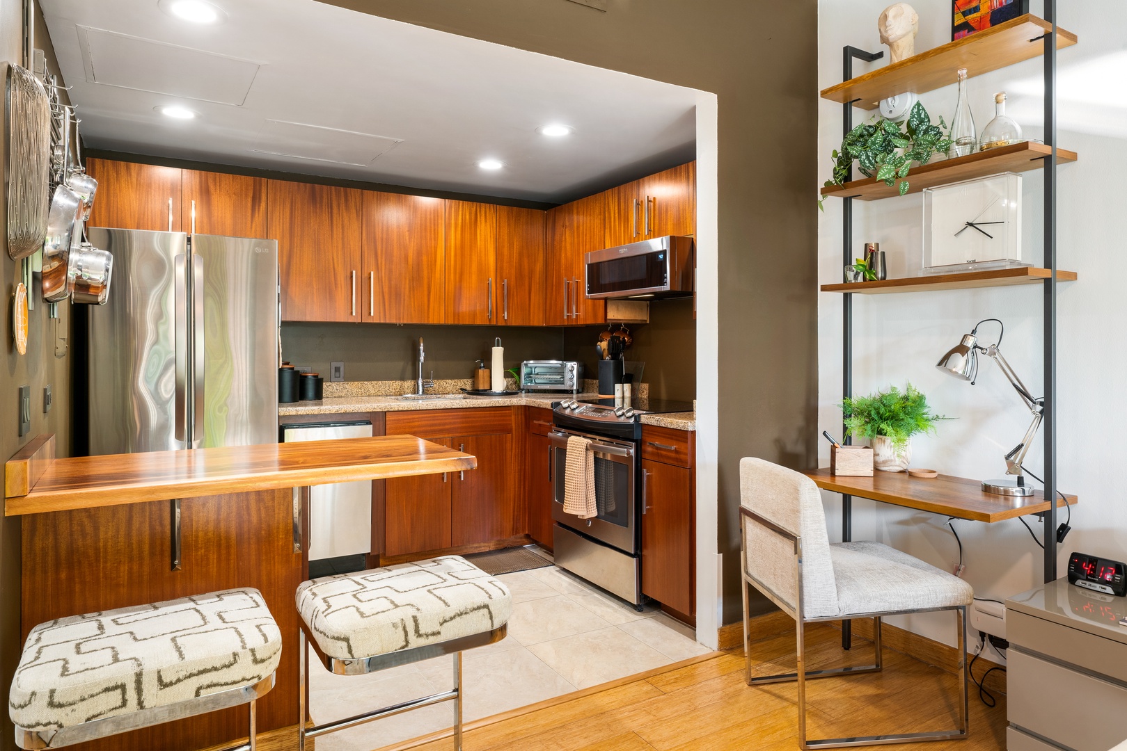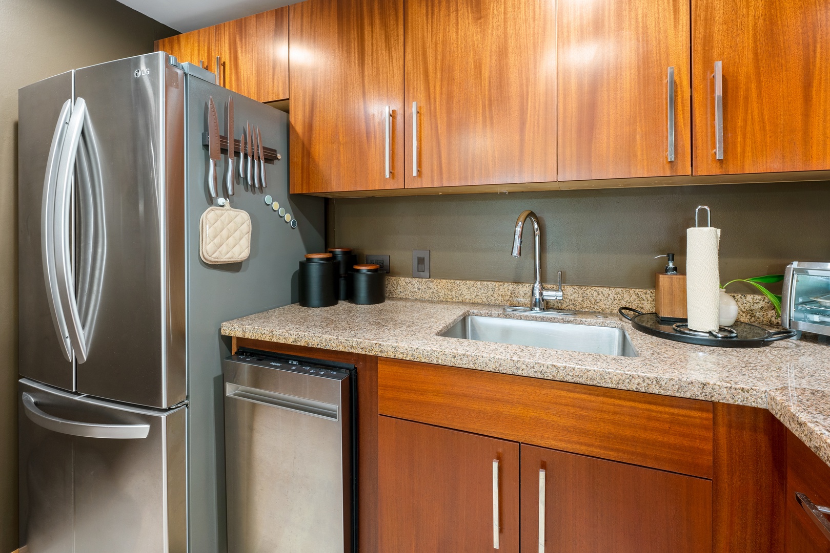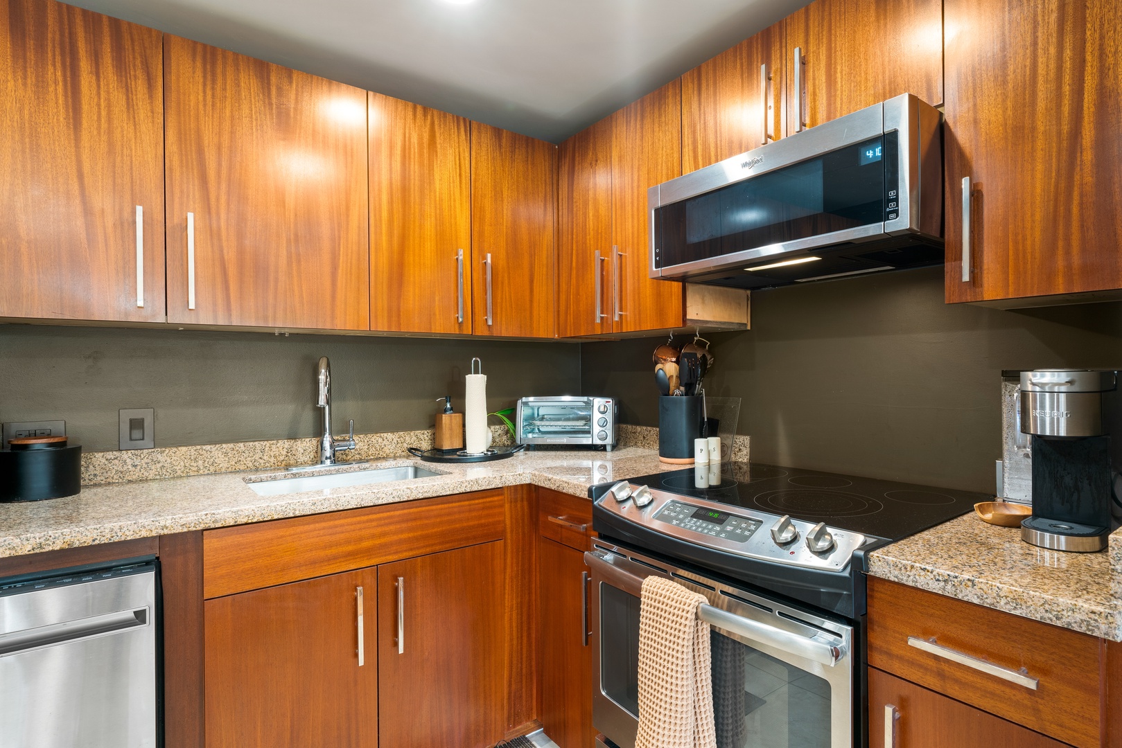 Enjoy a slow start to the day, in an adjustable king-sized bed watching your favorite shows on the large flat-screen cable TV. In this studio, every meal will be inspired by the modern chef’s kitchen, where you’ll have all the tools and necessities to prepare a gourmet meal. Stately mahogany veneer cabinets and solid countertops provide a generous amount of counter space to prepare meals. The kitchen has name-brand stainless-steel appliances including an LG refrigerator, Haier dishwasher, Keurig coffee pot, a Black & Decker toaster/oven, a Whirlpool microwave, and a five-burner stove/oven. The wooden peninsula has two bar stools for casual dining.