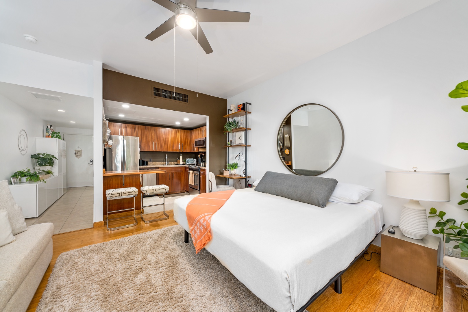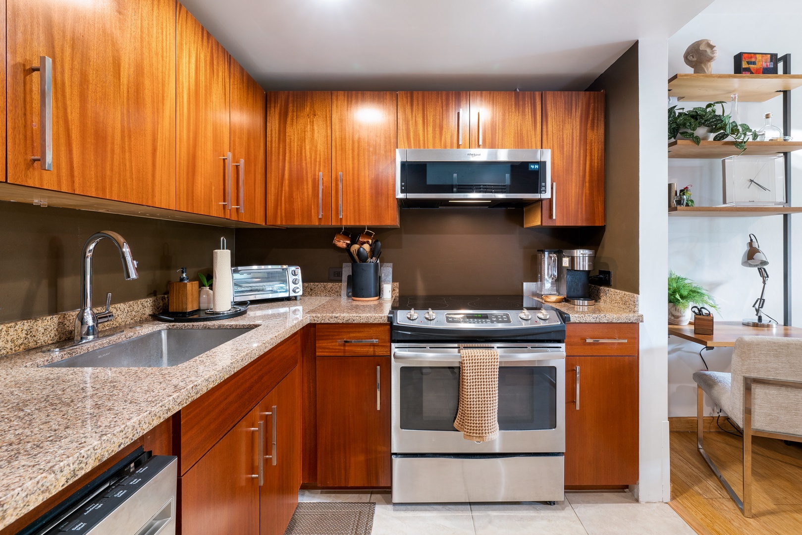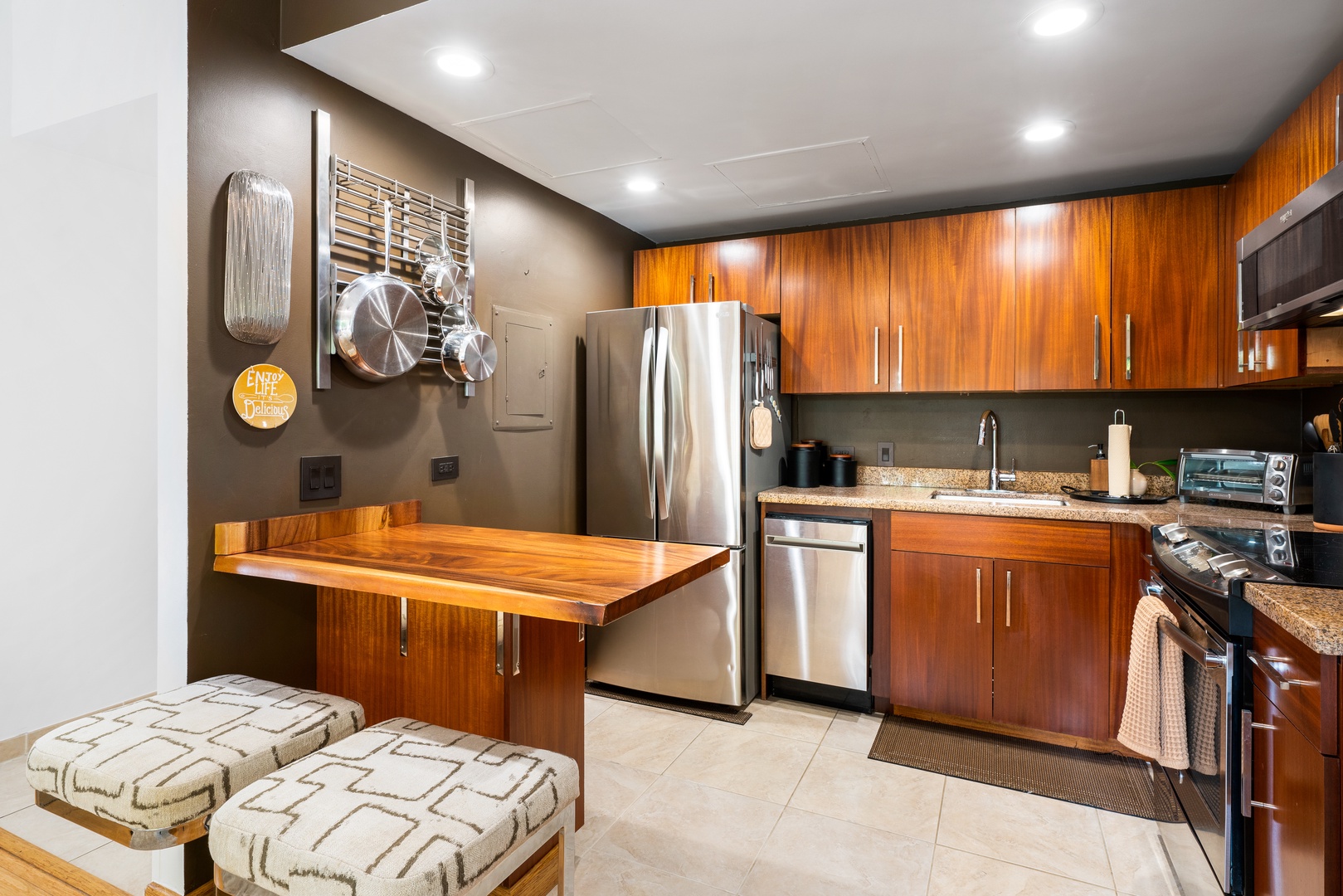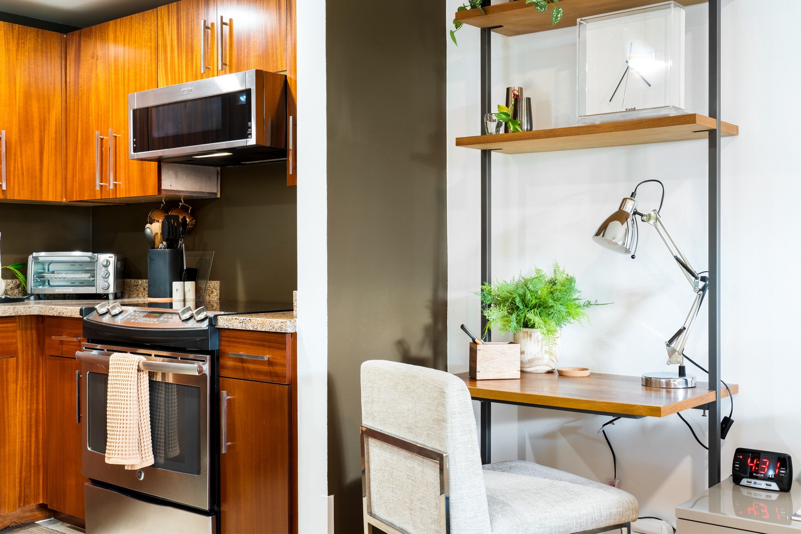 Enjoy a slow start to the day, in an adjustable king-sized bed watching your favorite shows on the large flat-screen cable TV. In this studio, every meal will be inspired by the modern chef’s kitchen, where you’ll have all the tools and necessities to prepare a gourmet meal. Stately mahogany veneer cabinets and solid countertops provide a generous amount of counter space to prepare meals. The kitchen has name-brand stainless-steel appliances including an LG refrigerator, Haier dishwasher, Keurig coffee pot, a Black & Decker toaster/oven, a Whirlpool microwave, and a five-burner stove/oven. The wooden peninsula has two bar stools for casual dining.
