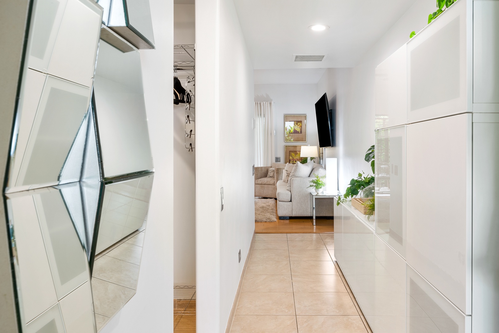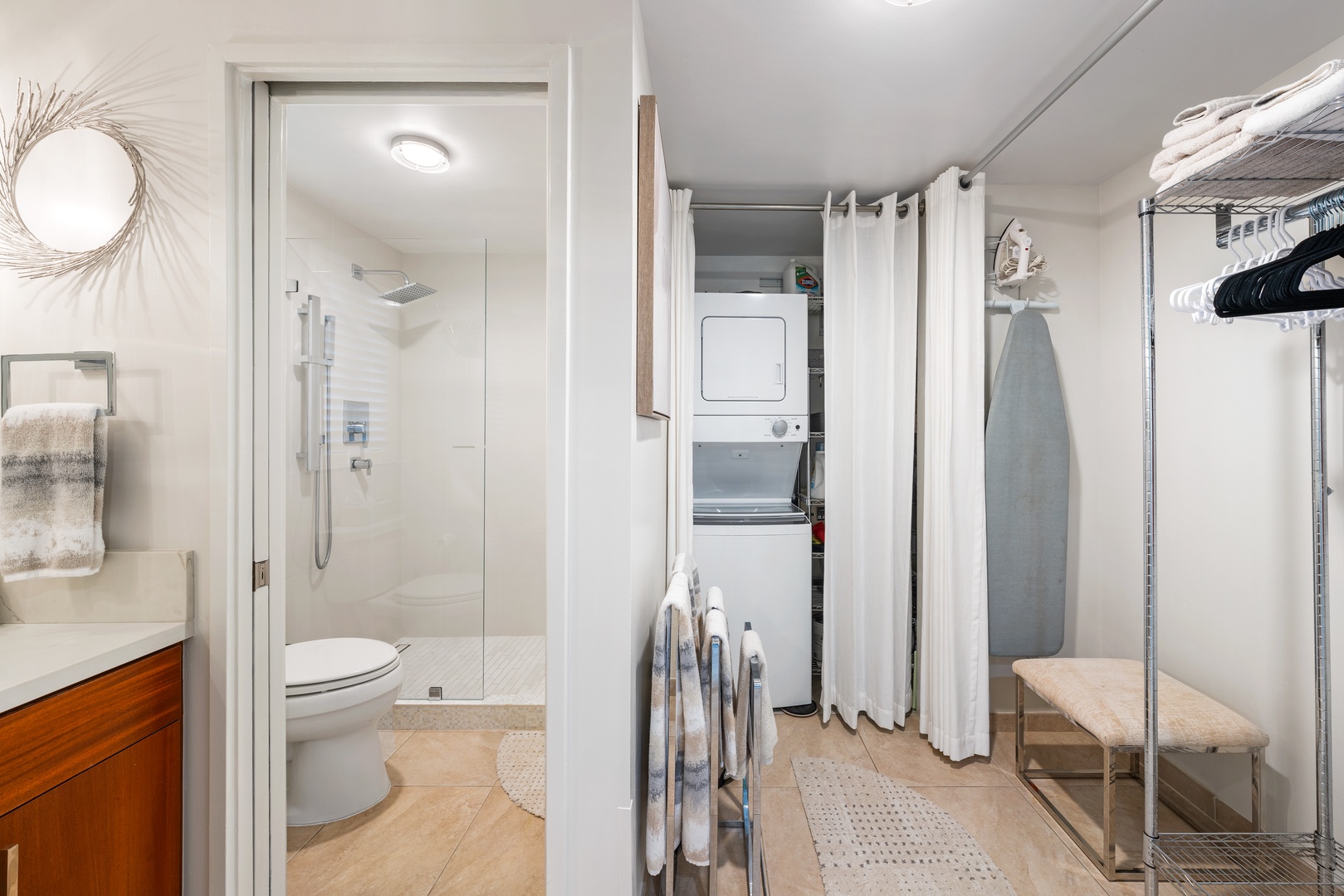 Guests will enjoy the bright white bathroom with a spa-like square rain shower head and plenty of counter space for toiletries. Complimentary artisanal toiletries and towels are provided too. Adjacent to the bathroom is the closet, with plenty of space to unpack and hang clothes. Guests will be able to easily clean clothes in the stackable washer/dryer.
