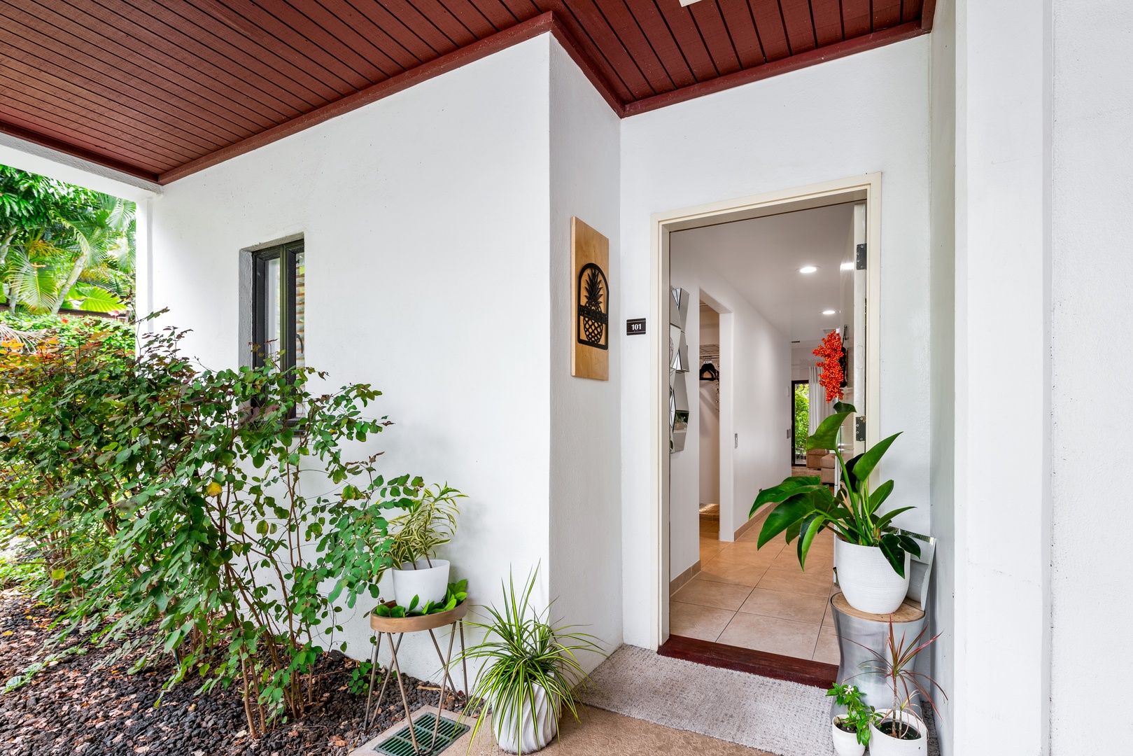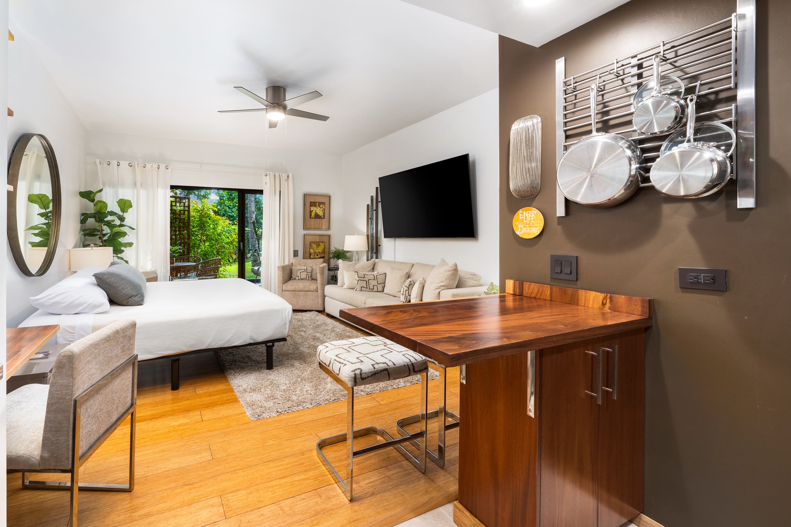 Royal Sea Cliff unit #101 is located on the ground level. This studio sleeps two guests in a king bed: Upon arrival at the front door, guests will be greeted with an abundance of colorful tropical plants. This studio features gorgeous tropical chic décor and sleek finishes. Floor-to-ceiling windows allow for garden views and natural sunlight, while air-conditioning and ceiling fans keep you at your preferred temperature during your stay.