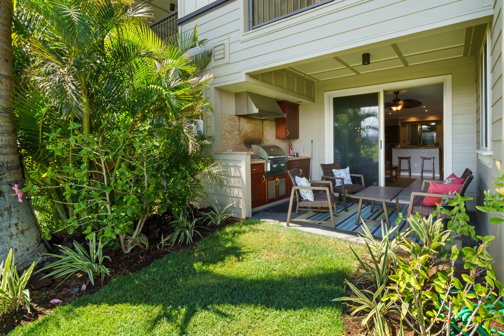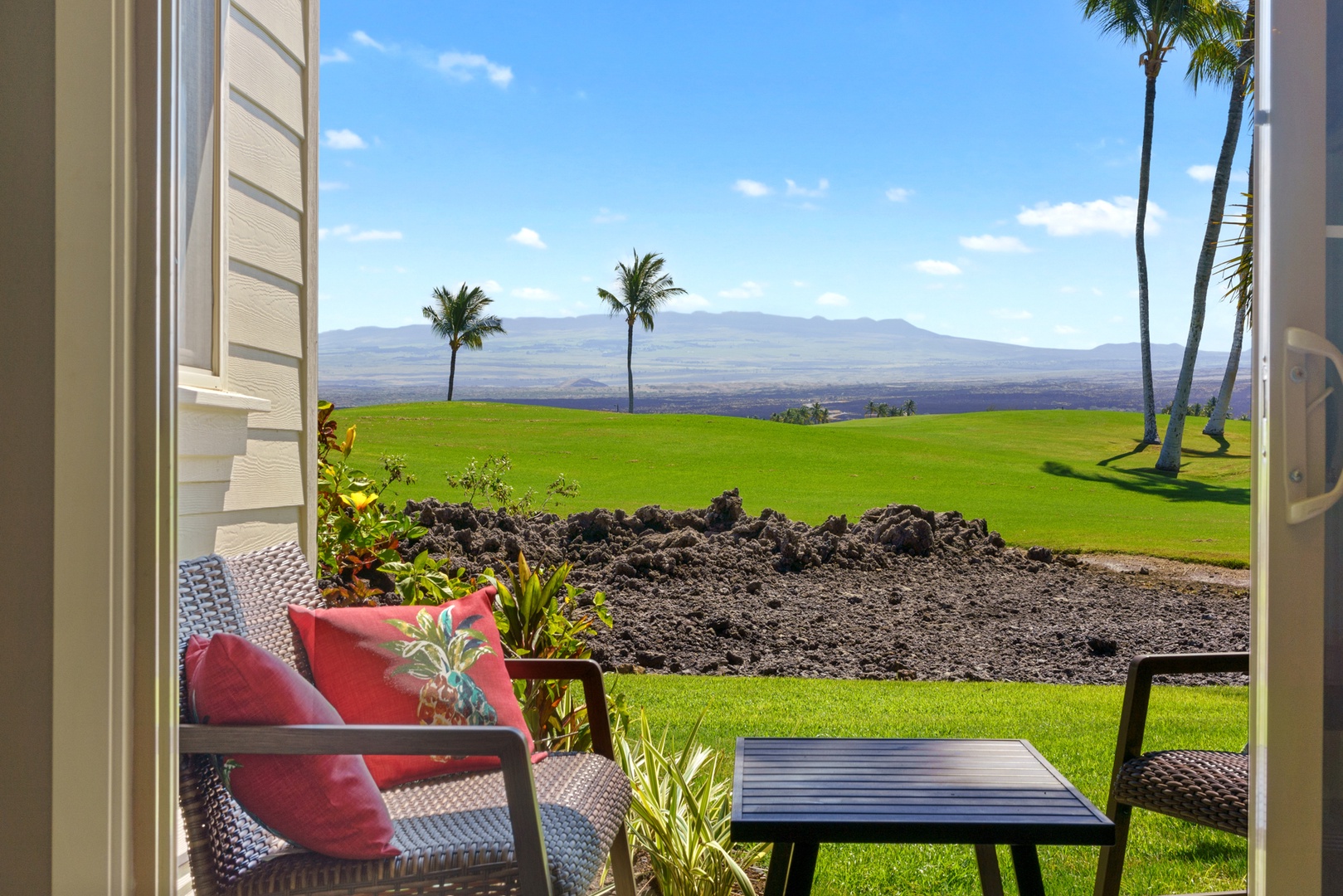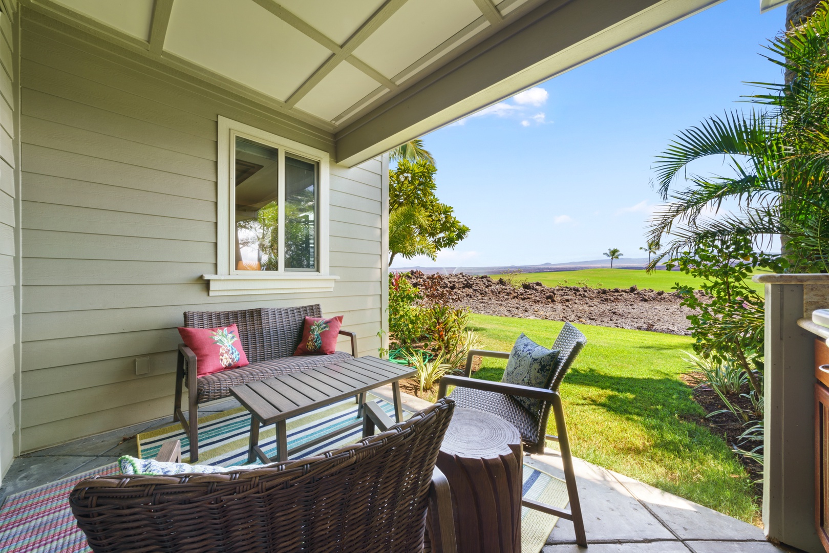 Golf Villas at Mauna Lani unit #A3: Floor-to-ceiling sliding glass doors allow for natural sunlight to flood the living area, leading to a furnished outdoor lanai where you can relax in comfort while taking in the majestic scenery and breathtaking views of Mauna Kea. There’s also a private chef’s grill for your use and large dining table for outdoor barbecues.