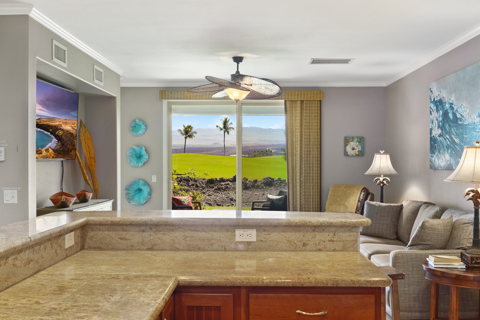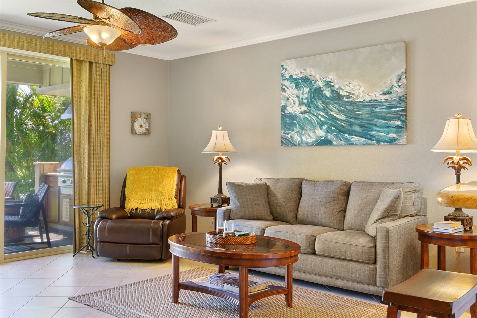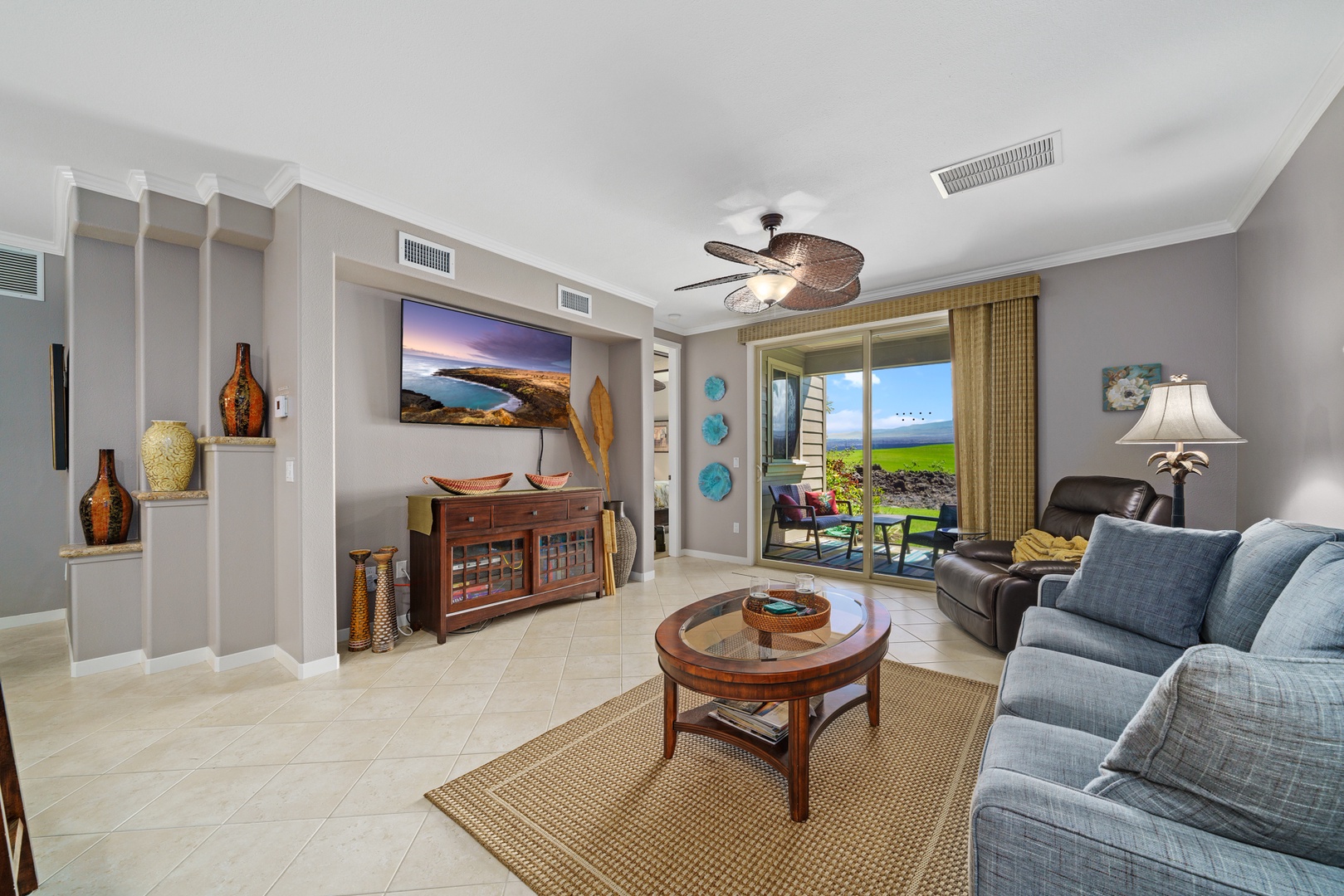 Golf Villas at Mauna Lani unit #A3: Floor-to-ceiling sliding glass doors allow for natural sunlight to flood the living area, leading to a furnished outdoor lanai where you can relax in comfort while taking in the majestic scenery and breathtaking views of Mauna Kea. There’s also a private chef’s grill for your use and large dining table for outdoor barbecues.