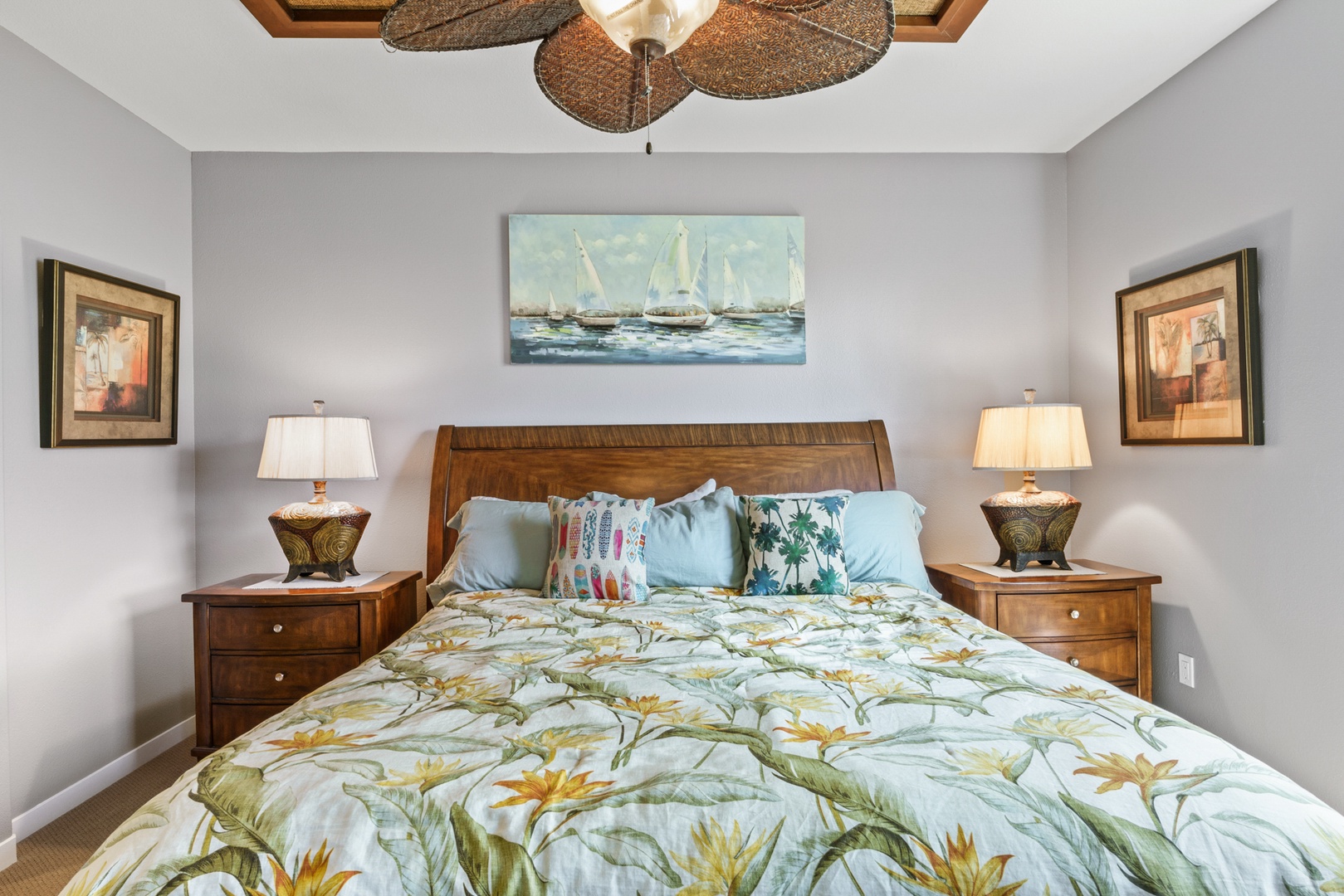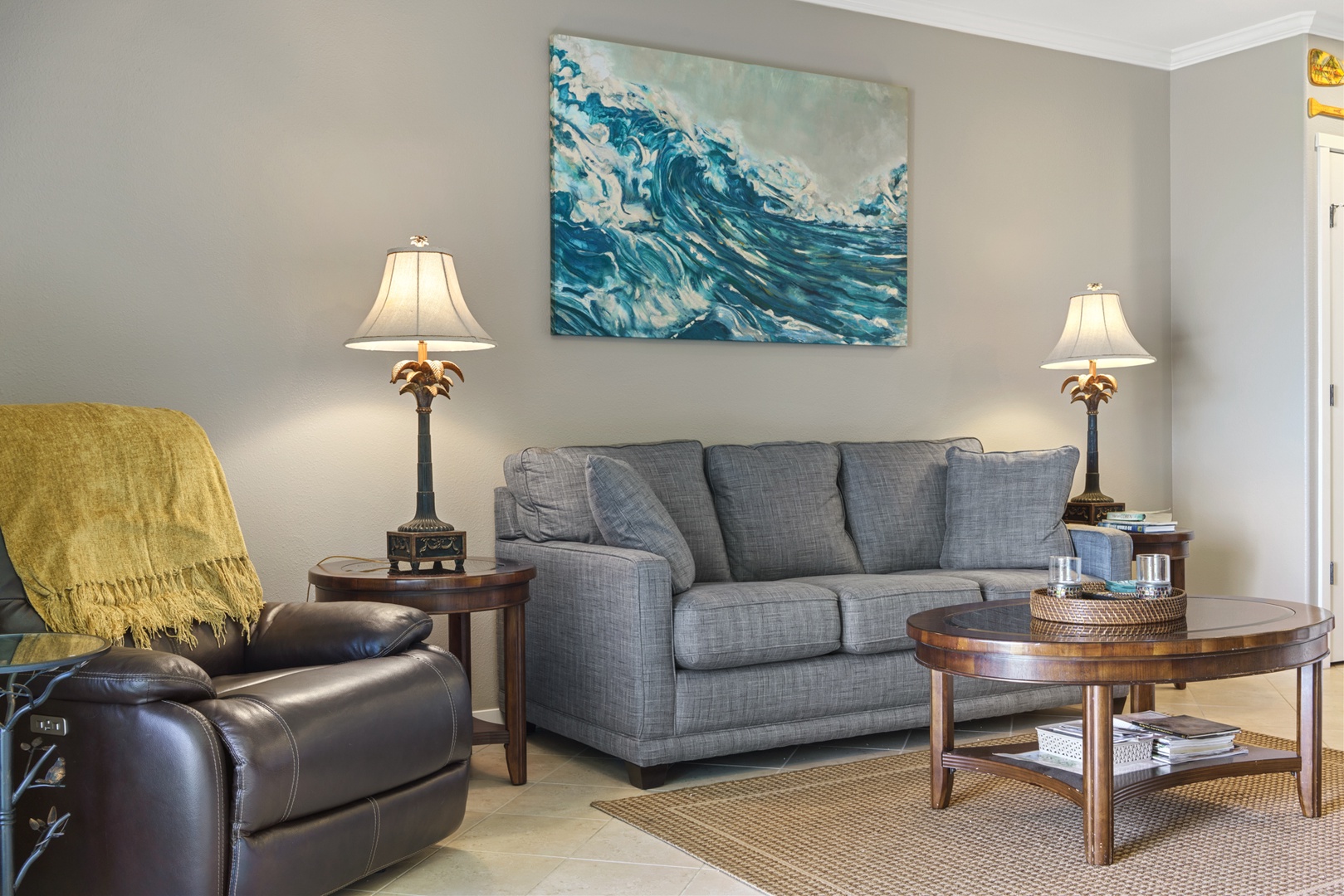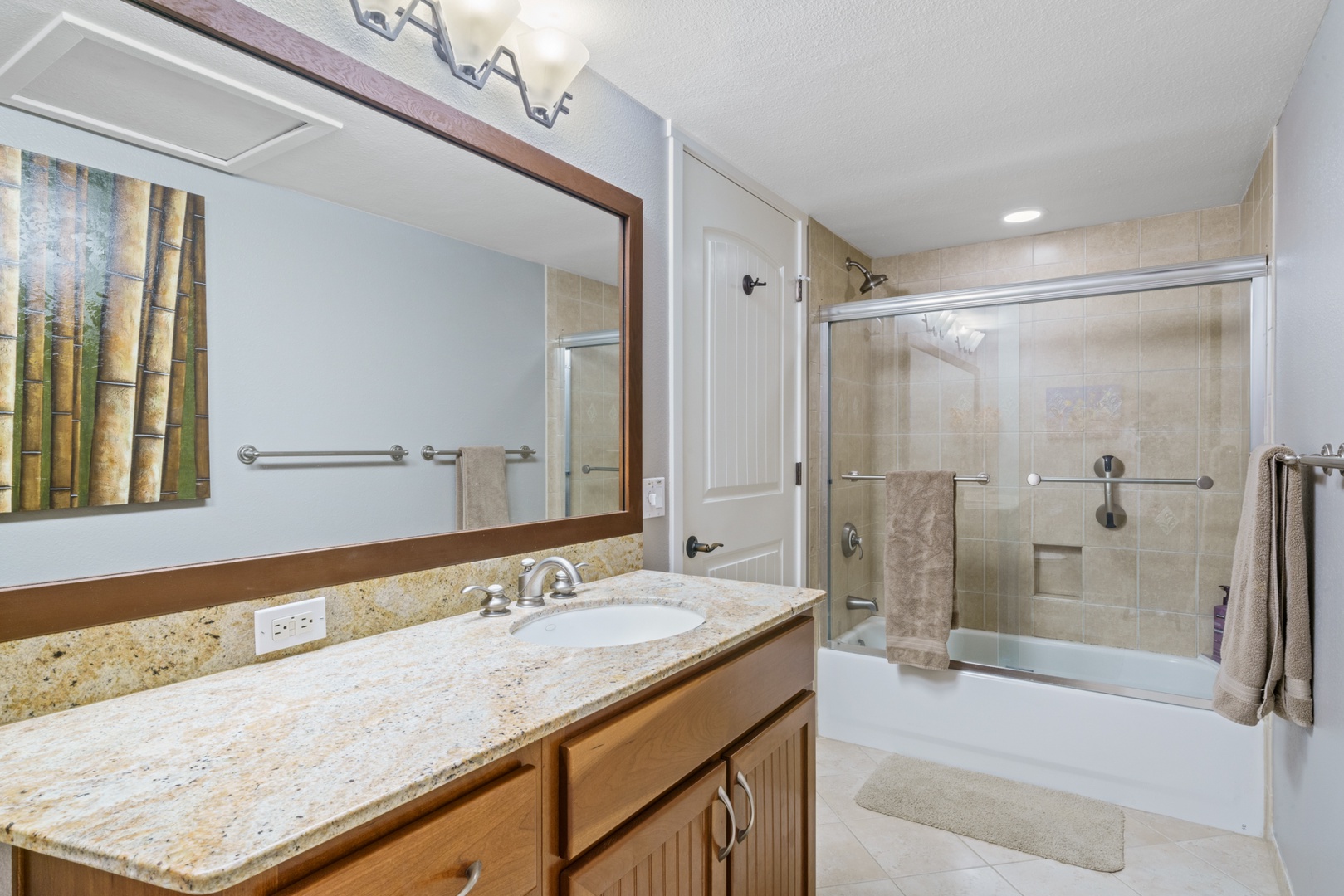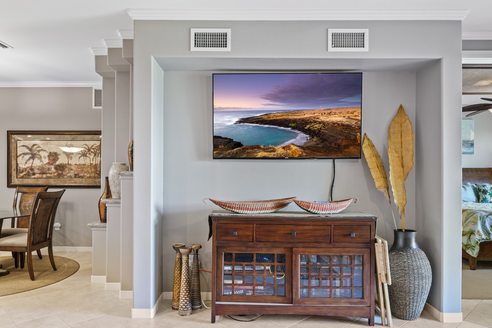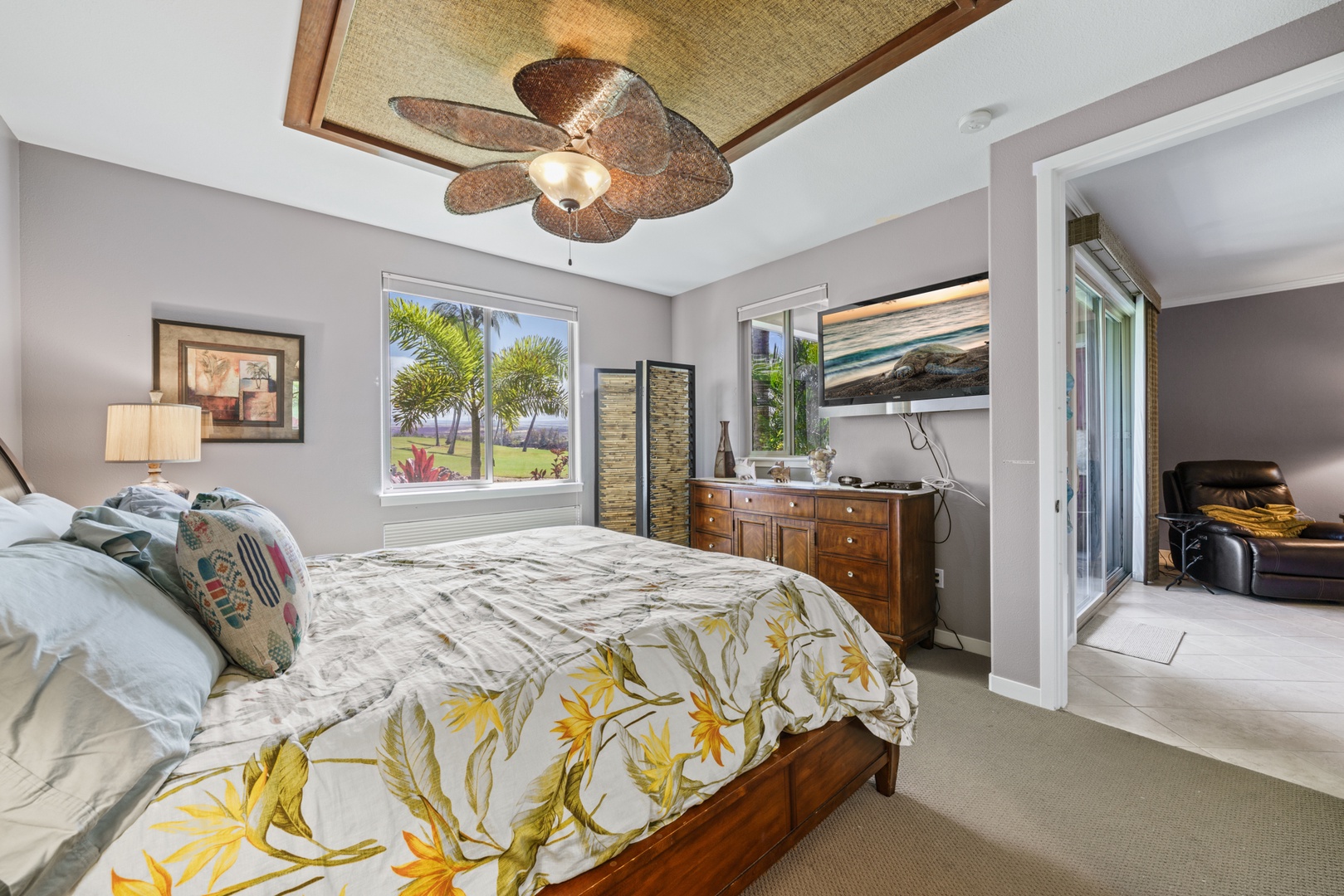 Relax in the living room after a day exploring and soak in the Hawaiian-style ambiance while sinking in to the plush furnishings to include a large sofa and recliner chair. The Master bedroom has a King Bed, while the second bedroom has two twin beds that can be converted to a King upon request, both providing plush pillows and fresh linens to ensure a peaceful night’s rest. For extra company, the sofa in the living room unfolds to a Queen-sized bed. Each bedroom is complete with a dresser, closet and a flat screen TV. The Master bedroom has an en suite bathroom with a double vanity, walk-in shower, and full tub for winding down and rejuvenating. The other bathroom is central to the living area and is complete with a single vanity and bathtub shower.