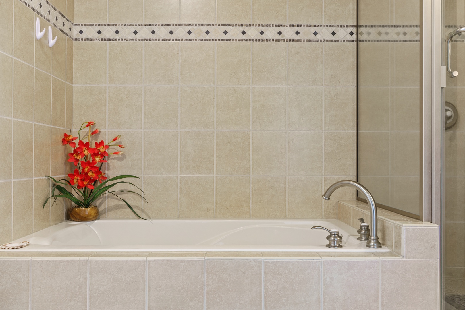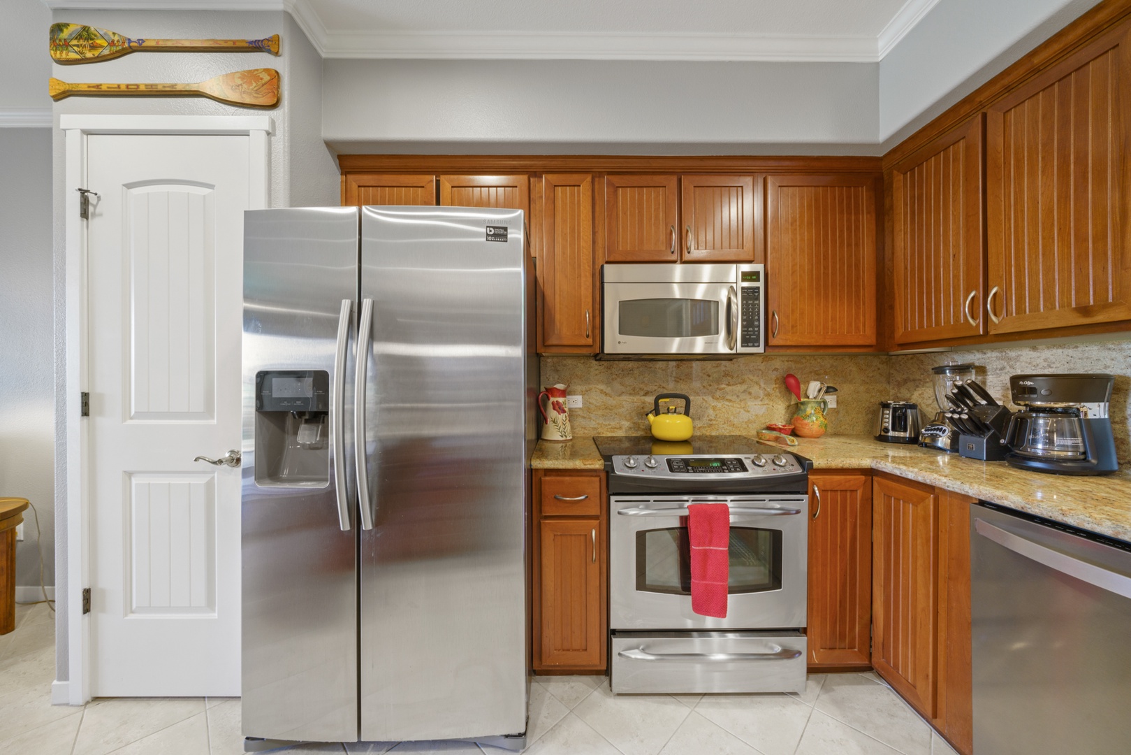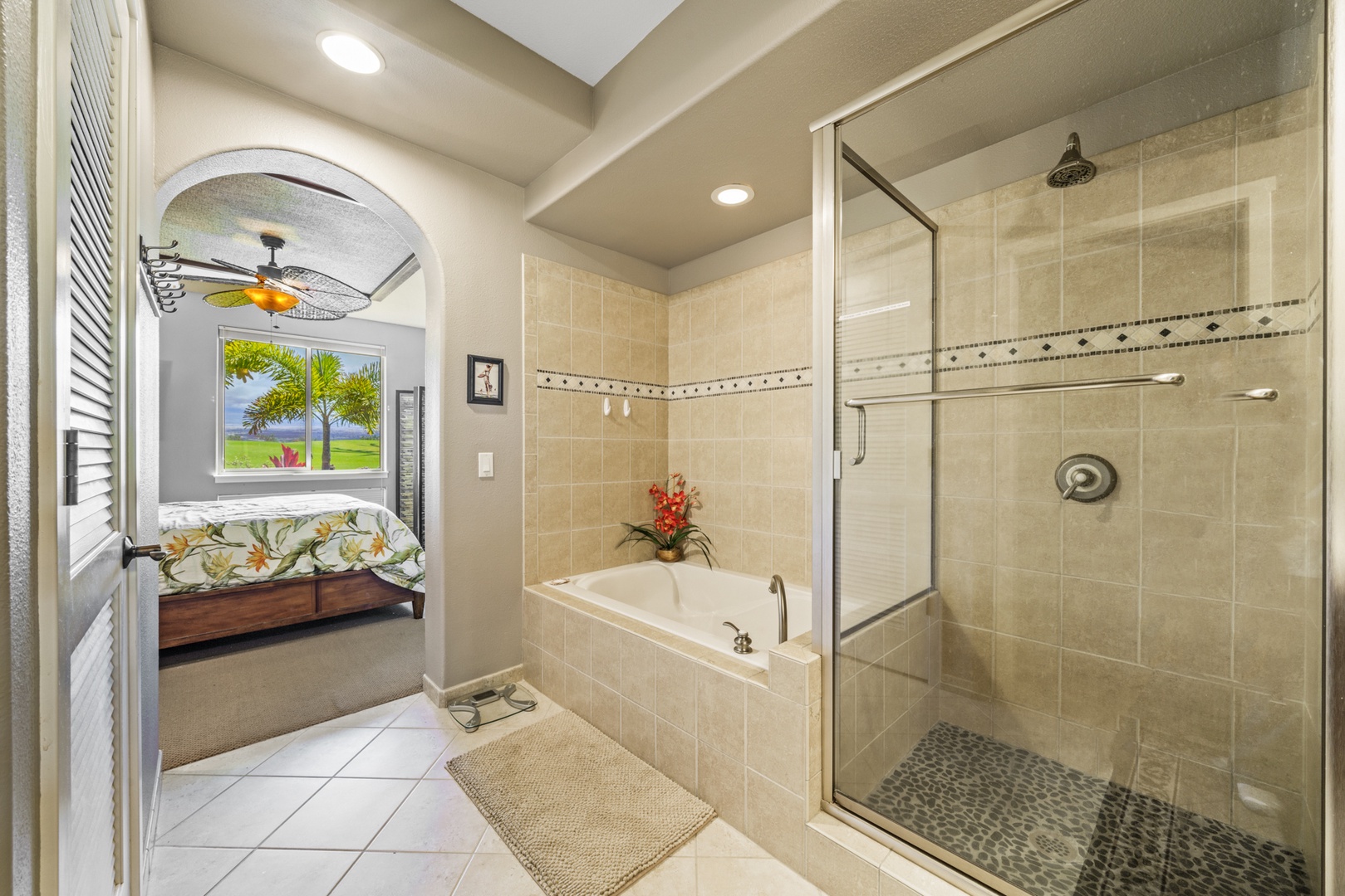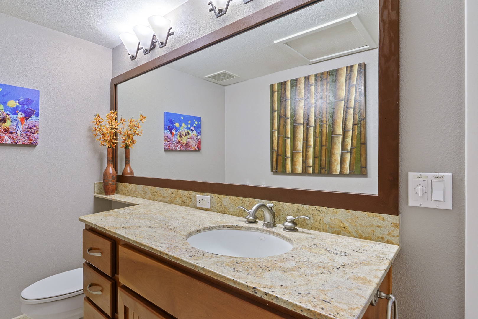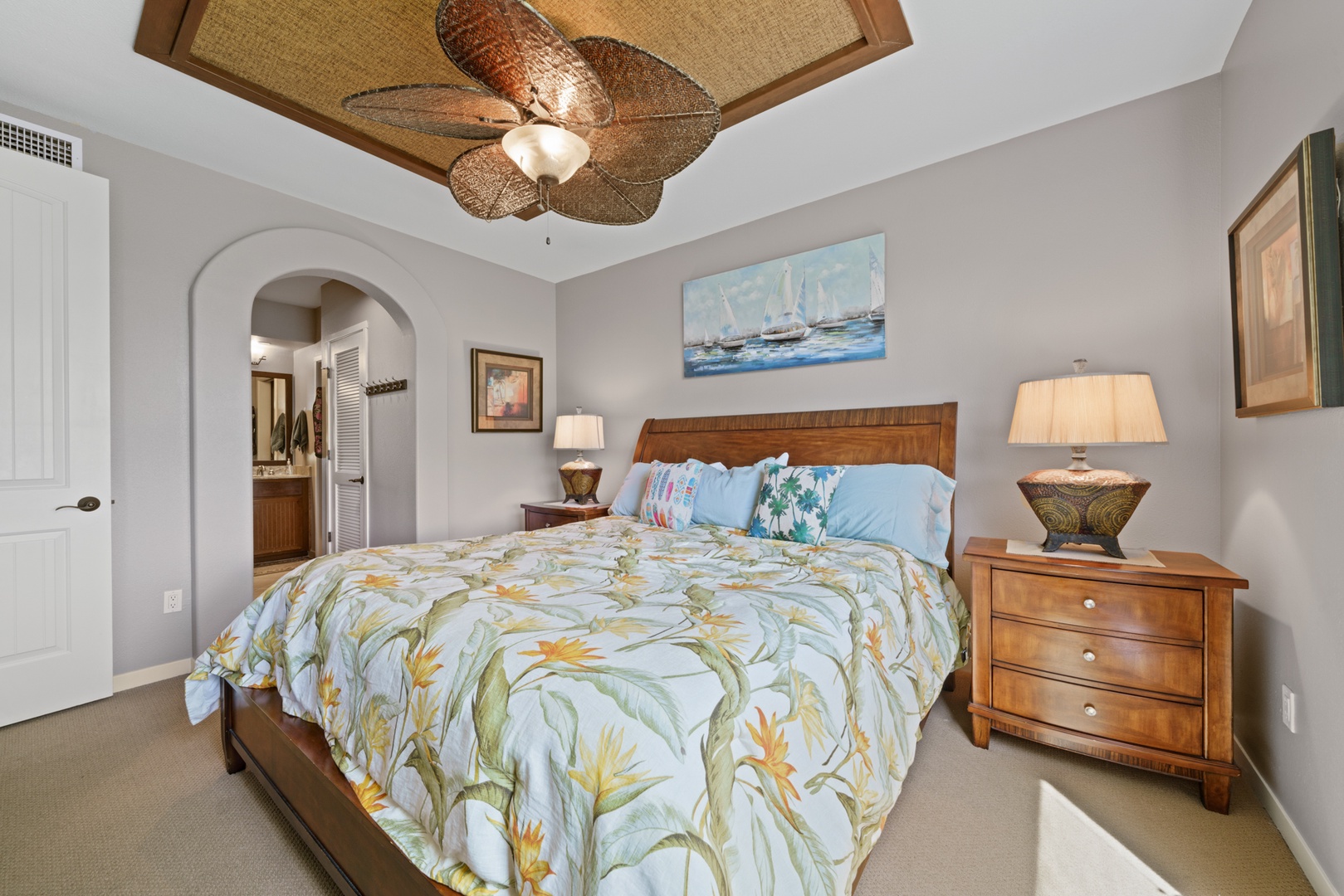 Relax in the living room after a day exploring and soak in the Hawaiian-style ambiance while sinking in to the plush furnishings to include a large sofa and recliner chair. The Master bedroom has a King Bed, while the second bedroom has two twin beds that can be converted to a King upon request, both providing plush pillows and fresh linens to ensure a peaceful night’s rest. For extra company, the sofa in the living room unfolds to a Queen-sized bed. Each bedroom is complete with a dresser, closet and a flat screen TV. The Master bedroom has an en suite bathroom with a double vanity, walk-in shower, and full tub for winding down and rejuvenating. The other bathroom is central to the living area and is complete with a single vanity and bathtub shower.