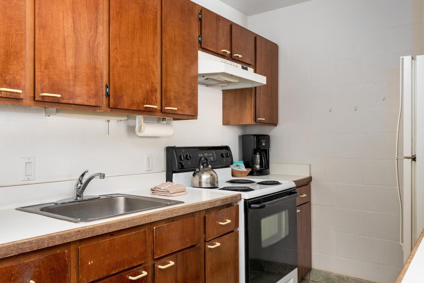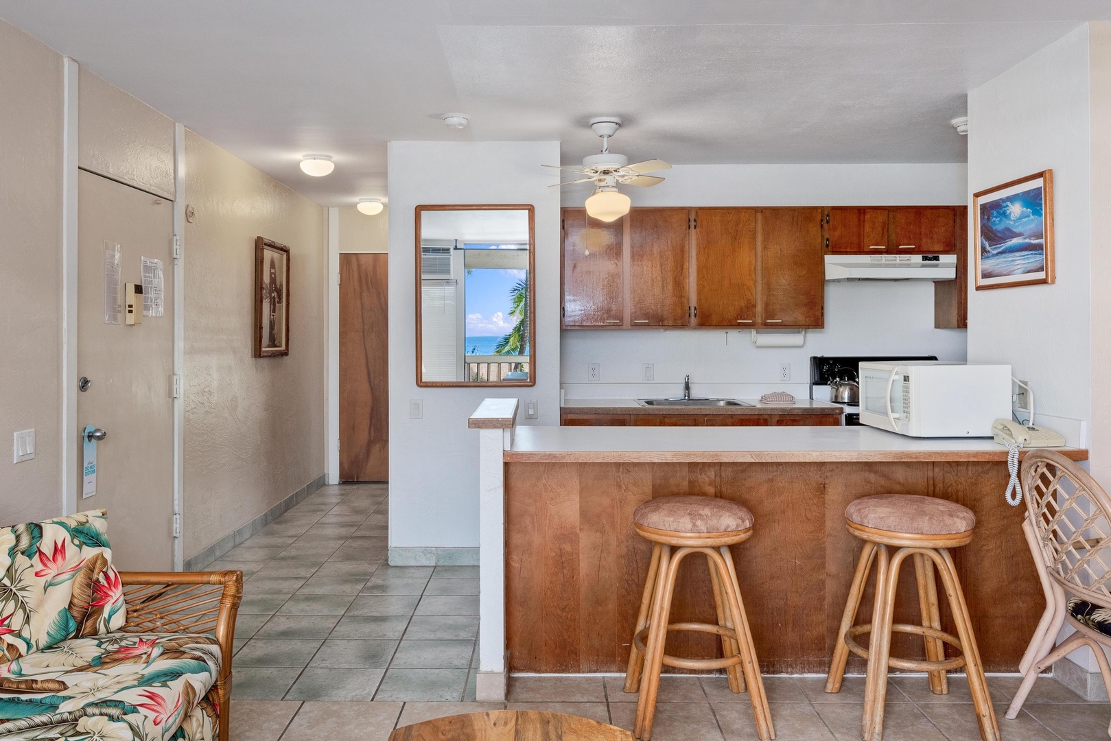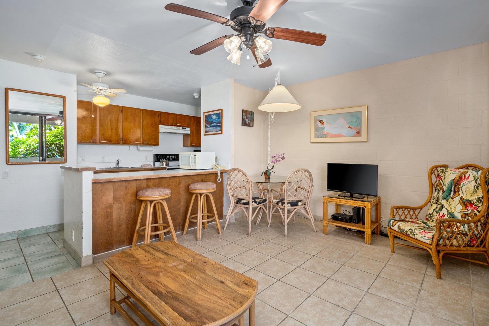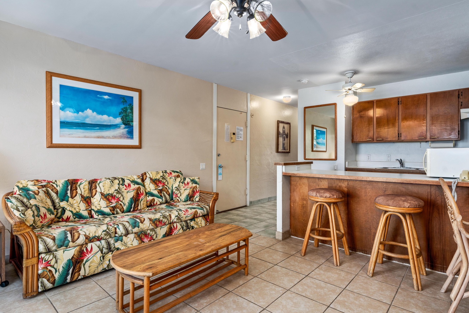 Unpack in the dresser that has three drawers and a bedside table to settle into island living. Simple tropical-themed touches compliment this modest room, including colorful bedding on the queen bed and rattan accents. The bedroom has a guest to help circulate the tropical breeze or air-conditioning from the living room. This unit sleeps four guests in one queen bed and a sofa bed.
