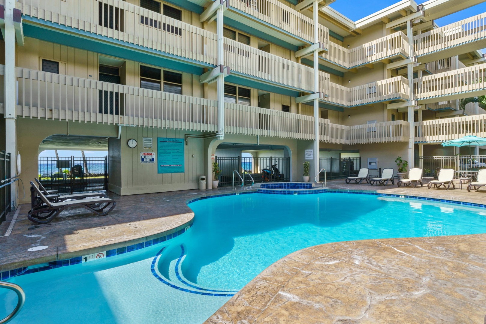Kona Bali Kai unit #167: Explore downtown Kailua-Kona easily from this comfortable ocean-view location. Upon entry, guests will see the crisp blue views from the floor-to-ceiling glass doors. Tile flooring and charming light rattan furniture compliment the main living space. Minimalistic pieces with pops of color decorate the entire unit.