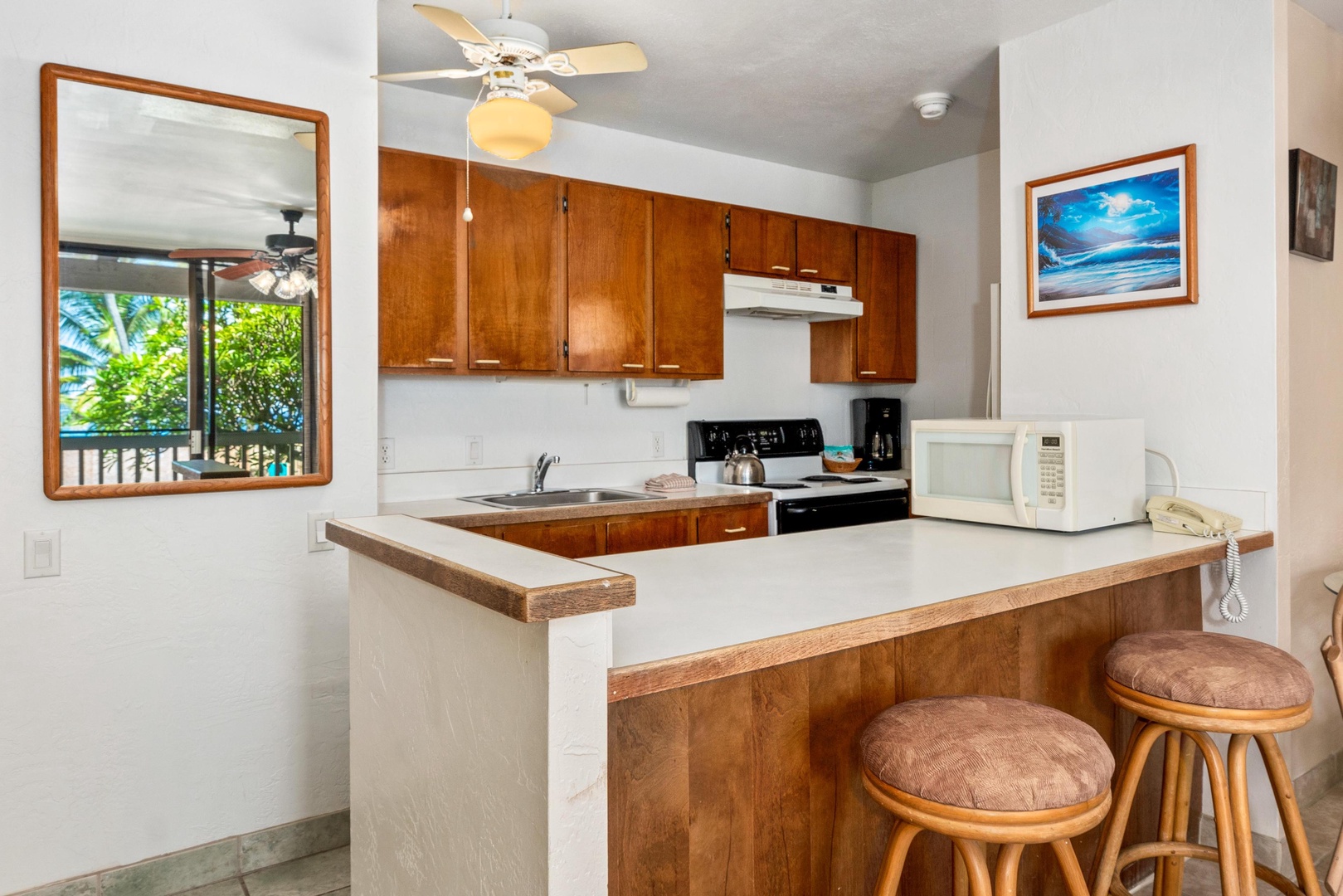 For home-cooked meals, the fully-equipped kitchen provides plenty of counter space for food preparation. The large kitchen island gives guests even more room to cook and also doubles as a bar for two to enjoy casual dining. Kitchen appliances include a stove, oven, full-sized refrigerator and freezer, blender, microwave, and toaster. There is also a coffee maker with complimentary local Hawaiian coffee.