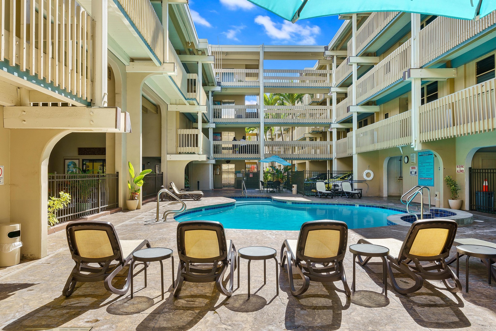 Walk out through the sliding door and continue to enjoy the Hawaiian breeze. Toast with a Mai Tai to a day of excitement on the private lanai with seating for two.