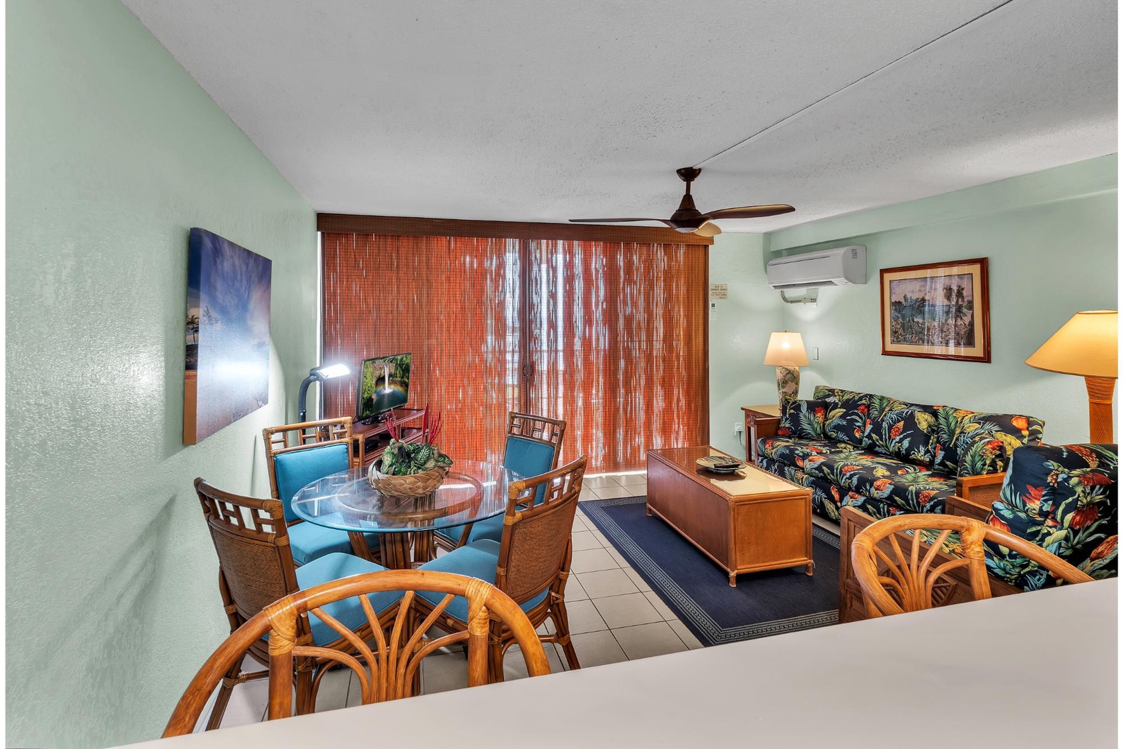 Sink into tropical comfort in your bright living space with vibrant Hawaiian-print furnishings, cooling ceiling fan, and beachside artwork.