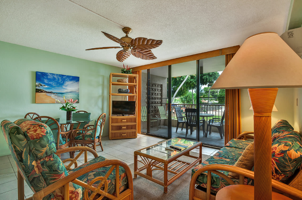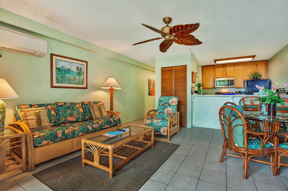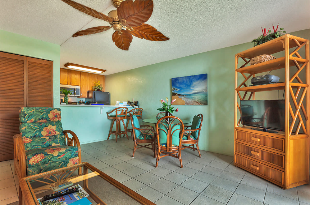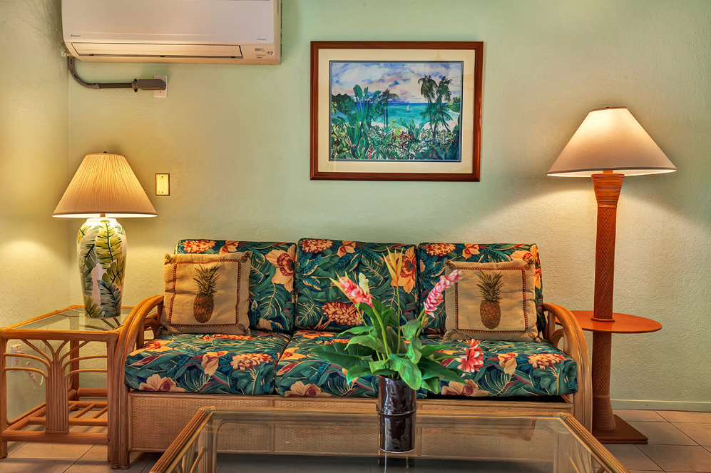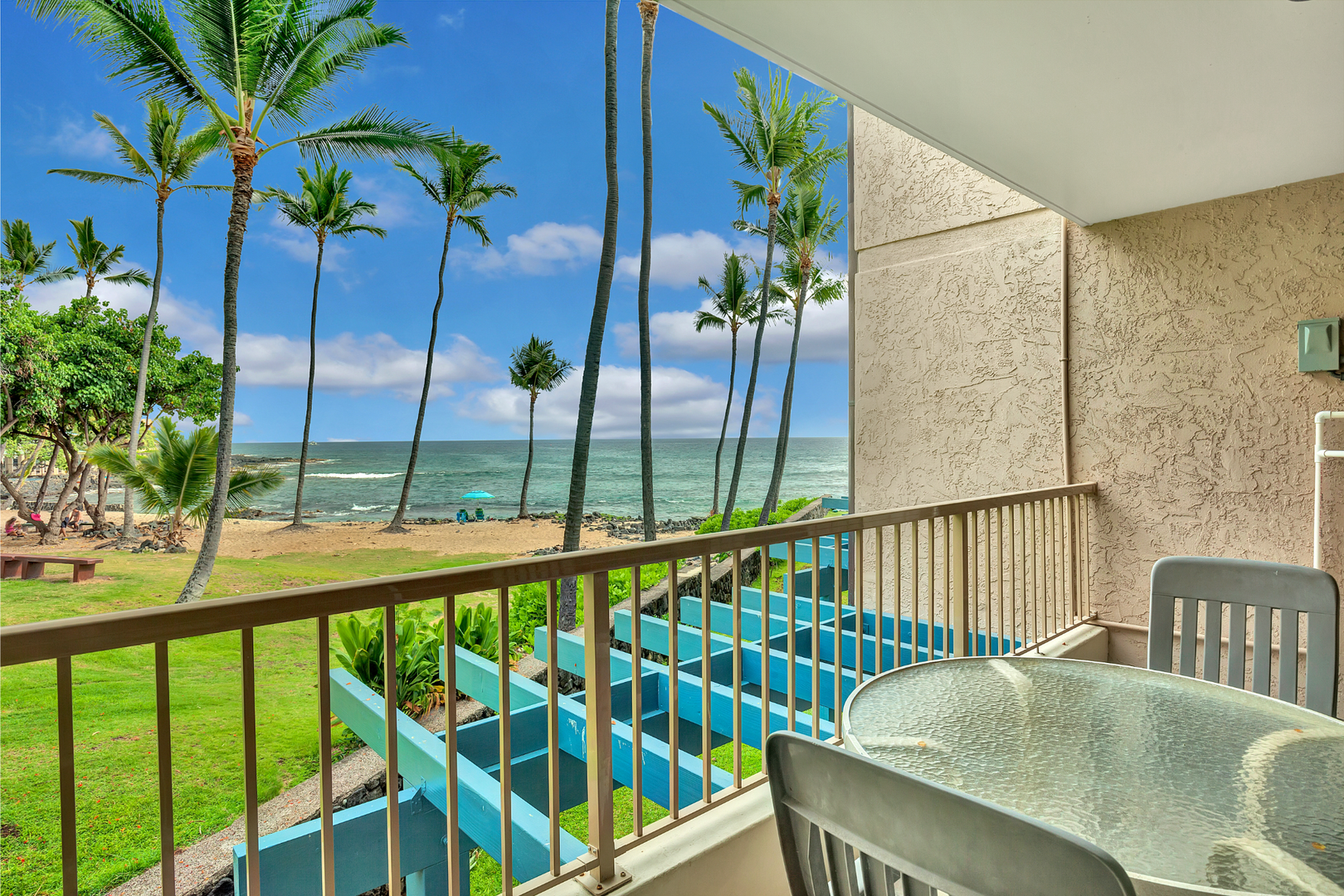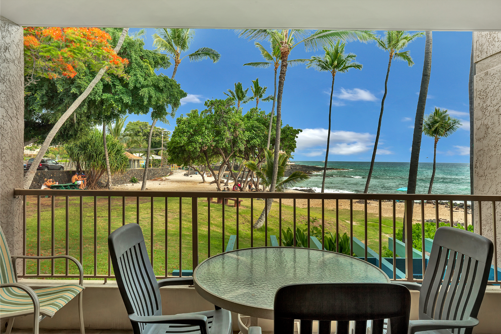 Located just a short walk from historic Kailua-Kona washer/dryer, flat screen TV, WiFi, and fully furnished private lanai add a touch of extra comfort for your stay. Sleeps up to four guests in one king and one sofa bed. Town, this spacious 630 sq. ft. vacation condo offers all the comforts of home for your vacation. Take in relaxing views of adjacent Honl’s Beach Park from your fully furnished lanai and enjoy our unit’s many conveniences including air conditioning and ceiling fans, washer/dryer, WiFi, flat screen TV, fully equipped kitchen with microwave, full-sized refrigerator, range/oven, appliances, and dishwasher. Sleeps up to four guests in one king and one sofa bed.
