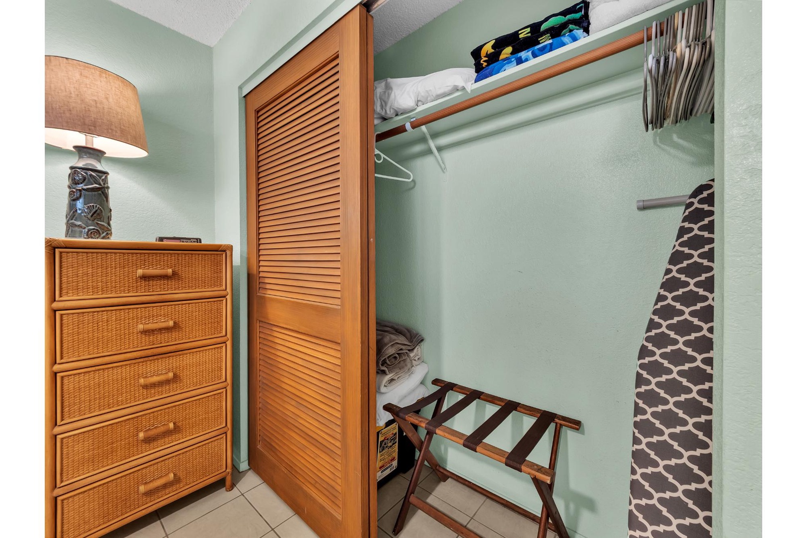 Your spacious walk-in closet offers plenty of storage with a charming dresser, hanging space, and tropical bamboo details for organized comfort.