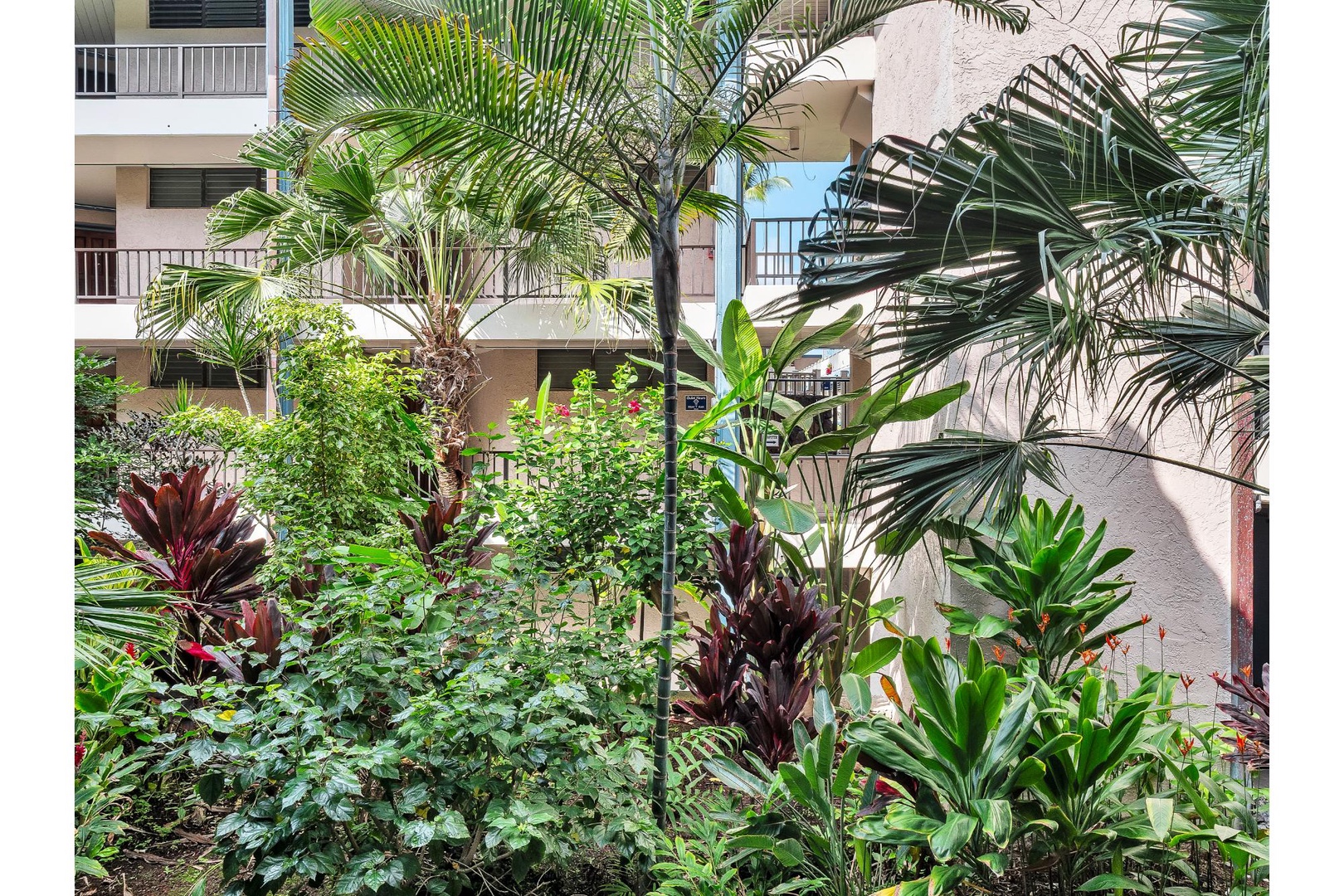Tropical gardens with lush palms and colorful plants create a peaceful oasis around the property buildings.