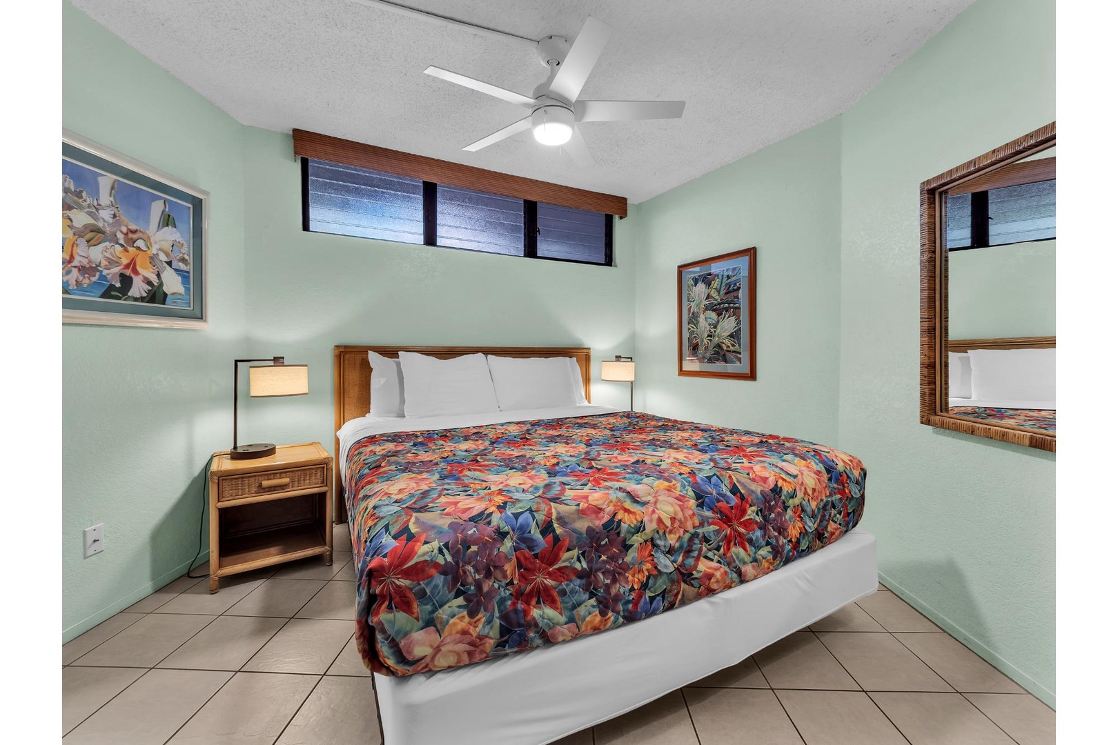 Your tropical bedroom features calming mint walls, vibrant floral bedding, and convenient amenities like AC and ceiling fan for ultimate comfort.