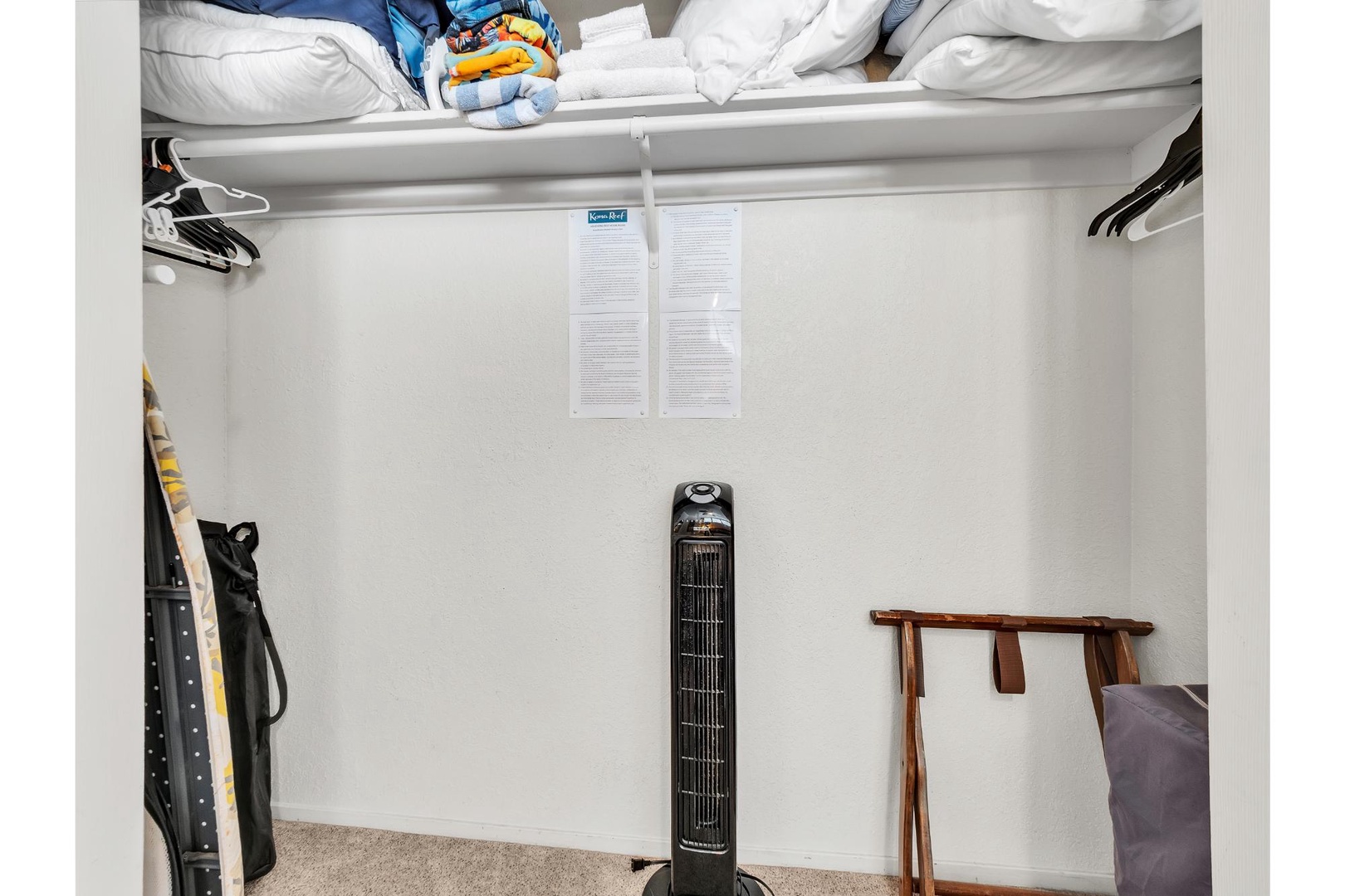 Your walk-in closet offers ample storage with shelving, hanging space, and convenient extras like a tower fan to keep things fresh.