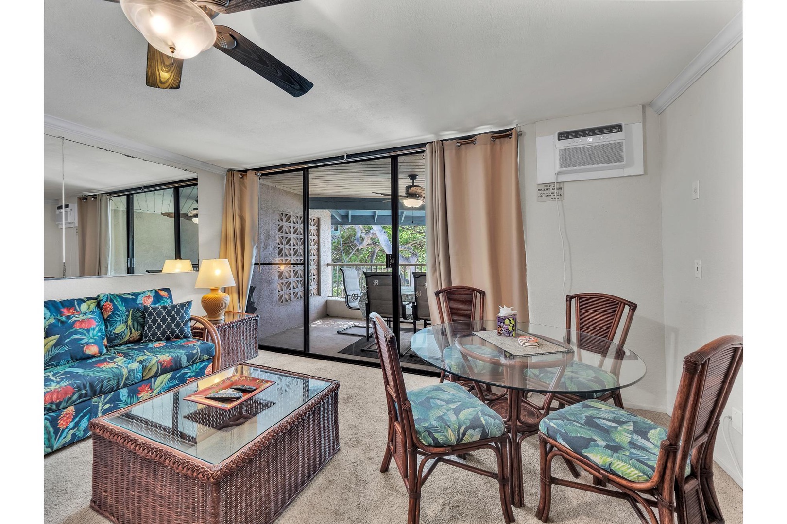 Dine al fresco on your private covered balcony with stunning tropical views and gentle breezes from the ceiling fan above.