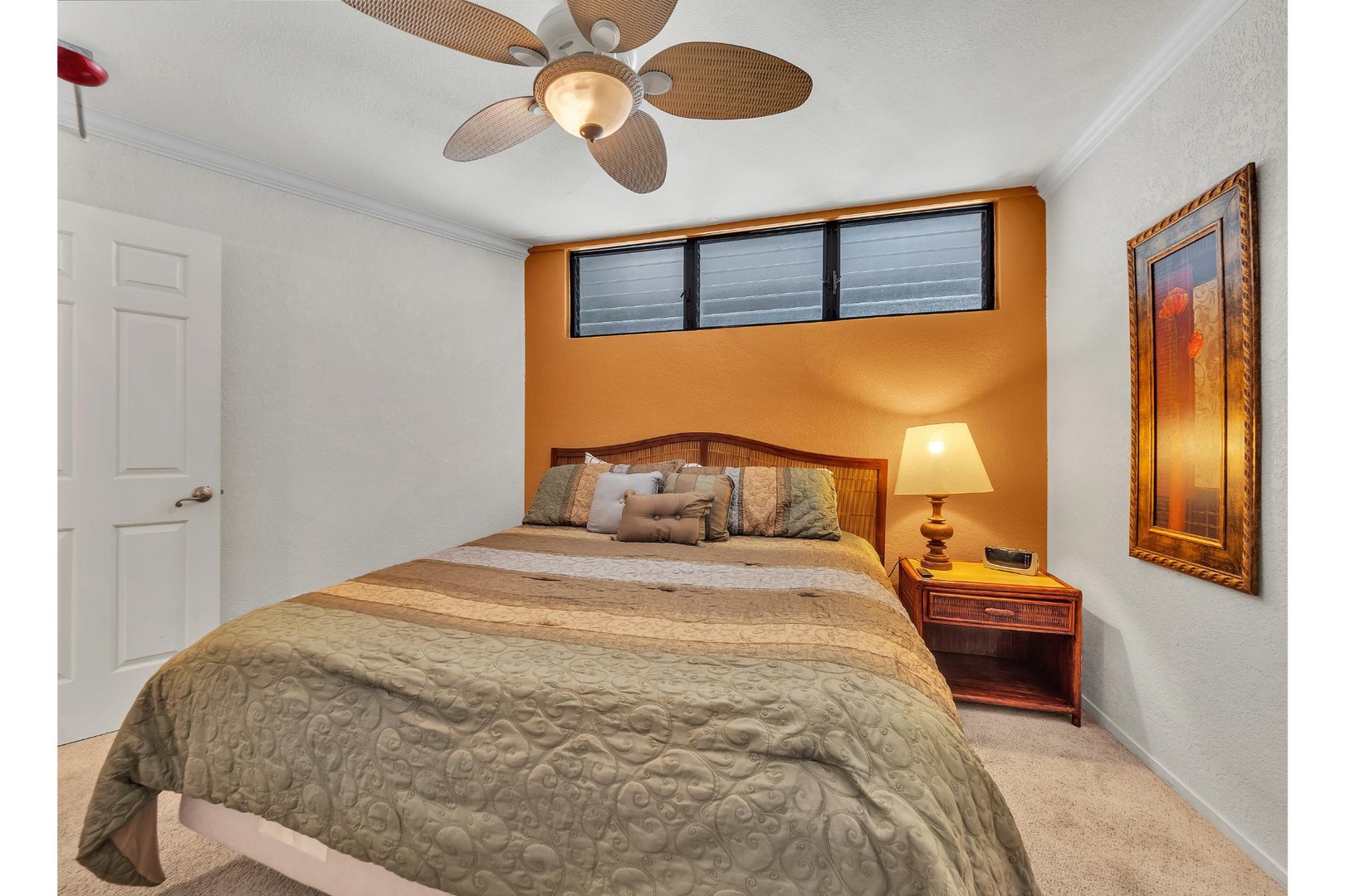 Rest peacefully in your cozy bedroom with warm earth tones, plush bedding, and a gentle ceiling fan to keep you cool.
