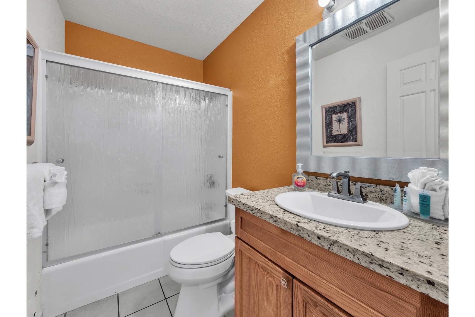 Step into your cheerful private bathroom featuring warm orange accents, granite countertops, and a relaxing tub-shower combo for unwinding after your adventures.
