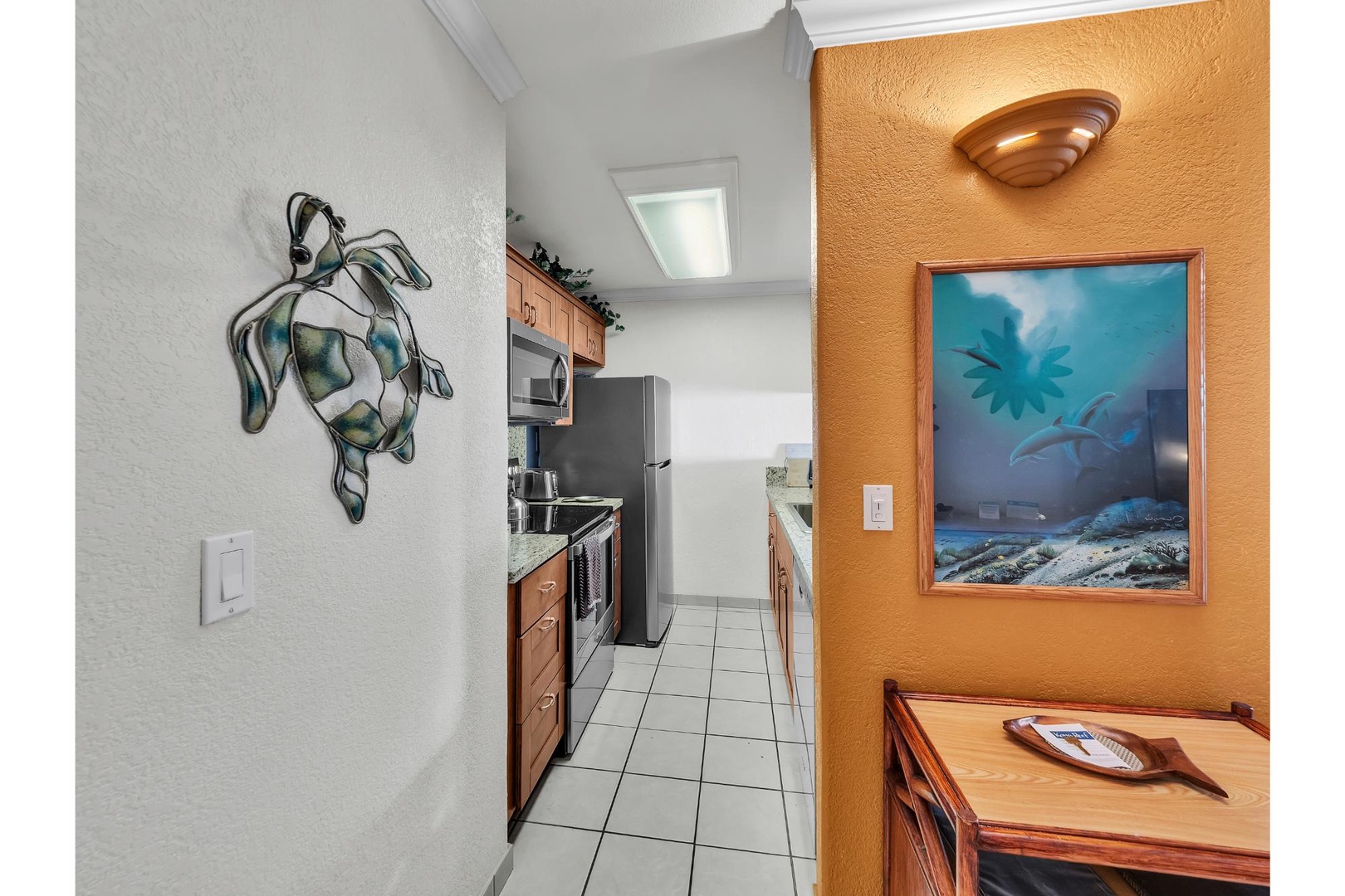 Your tropical-themed living space seamlessly flows into a fully equipped kitchen, creating the perfect setting for relaxing vacation moments.
