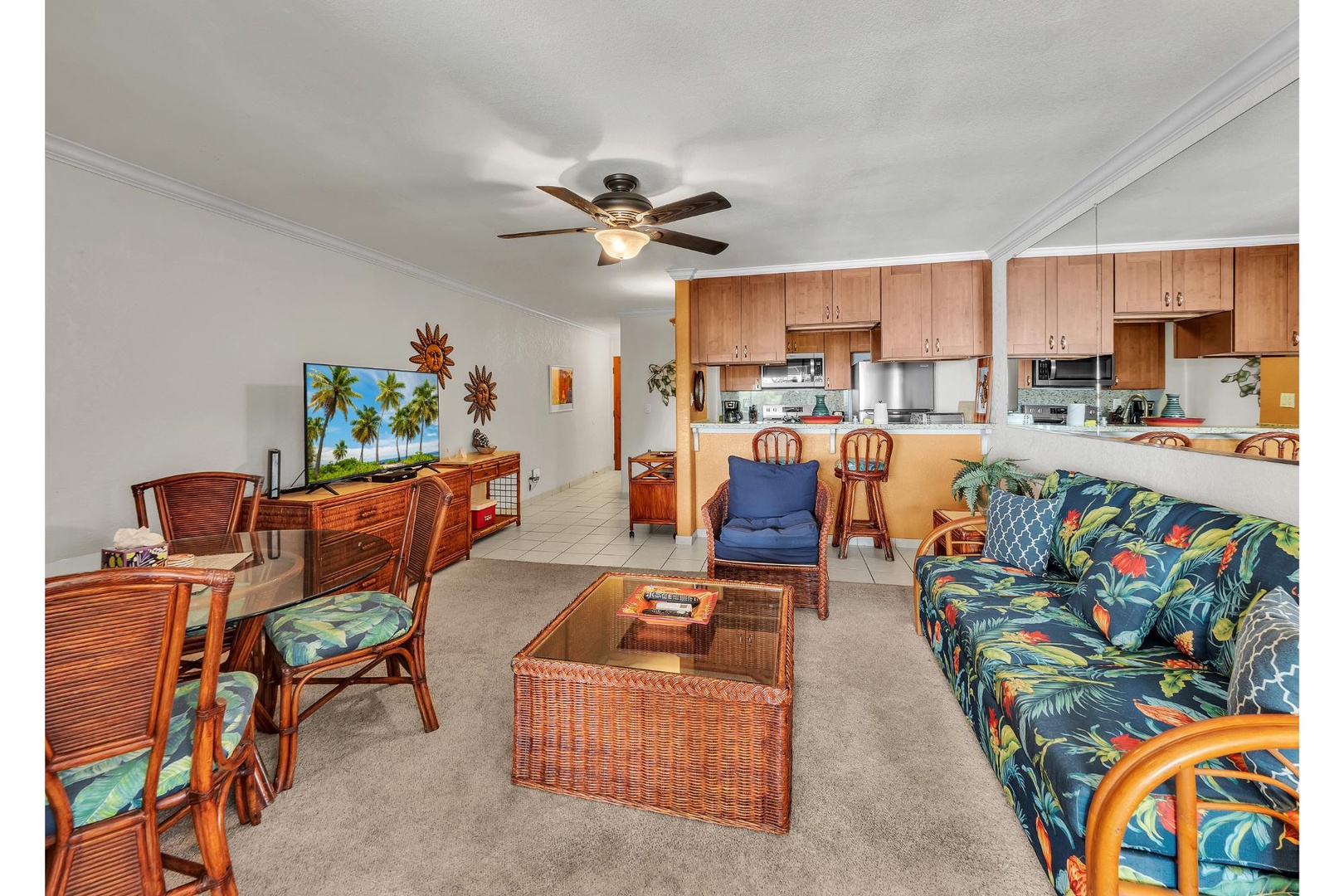 Unwind in this tropical-themed living space with vibrant Hawaiian furniture, open kitchen, and island-inspired décor that instantly transports you to paradise.