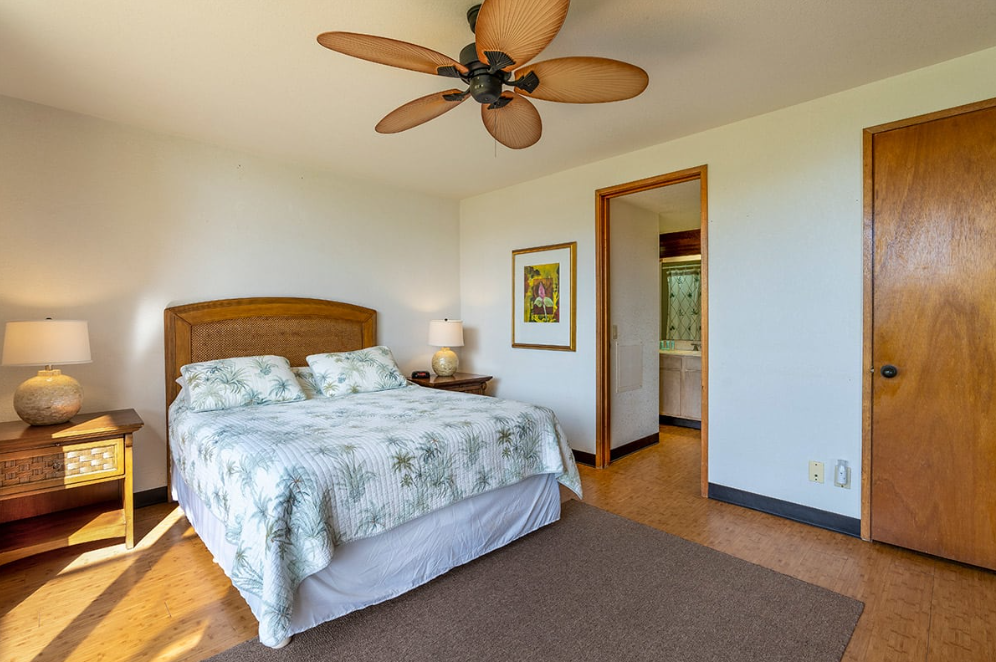 Makahuena at Poipu 2104: Toast a perfect day with Kauai rum Mai Tais and farmers market treats on your ground floor ocean view lanai flowing to landscaped lawns and the Pacific. Comforts include an open kitchen, cool wood floors, washer/dryer, ceiling fans, flat-screen and WiFi. Sleeps 4 in 1 Queen and 2 twin beds within 1,145sf. There are three ceiling fans, one in the living room, one in the master-bedroom, and one in the guest room.