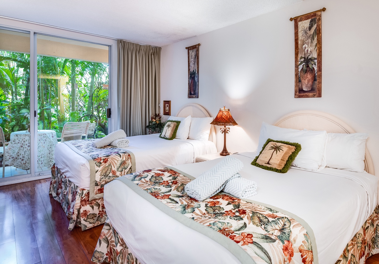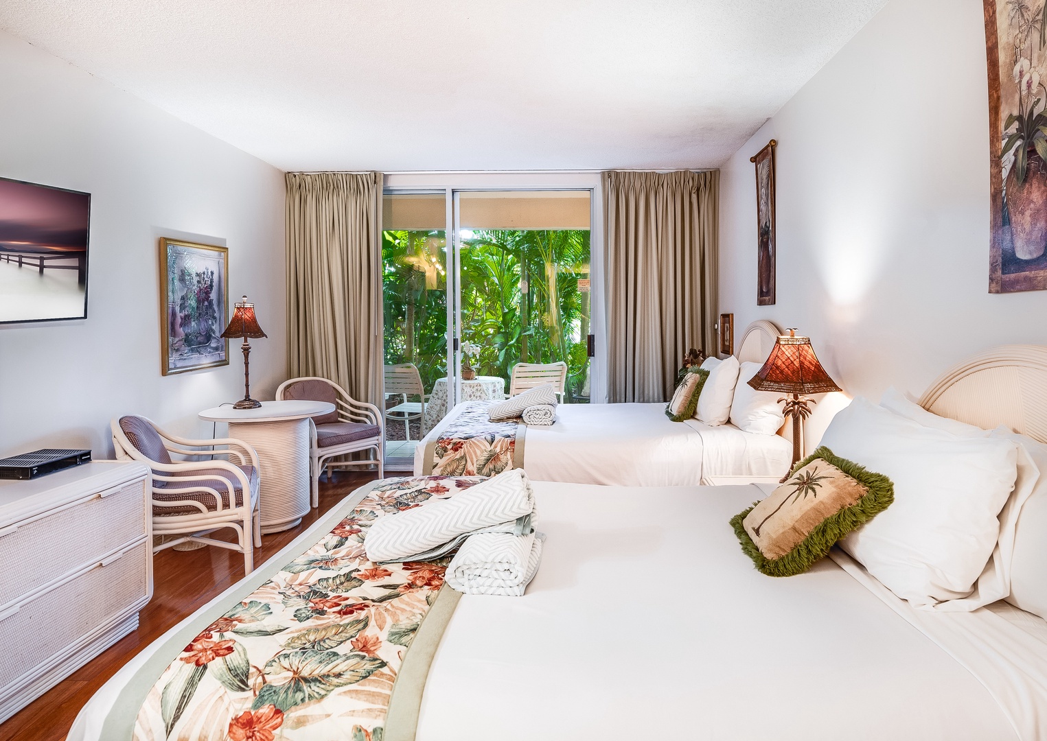 Maui Banyan T108AB: With a functional floor plan and connecting door make this the ideal two-bedroom/two-bathroom ground floor unit for a family getaway. Exotic patterns and warm color tones set the mood while oversized windows allow for natural light and serene garden views from every room. Set the temperature to your liking with air-condition units and ceiling fans throughout the unit.