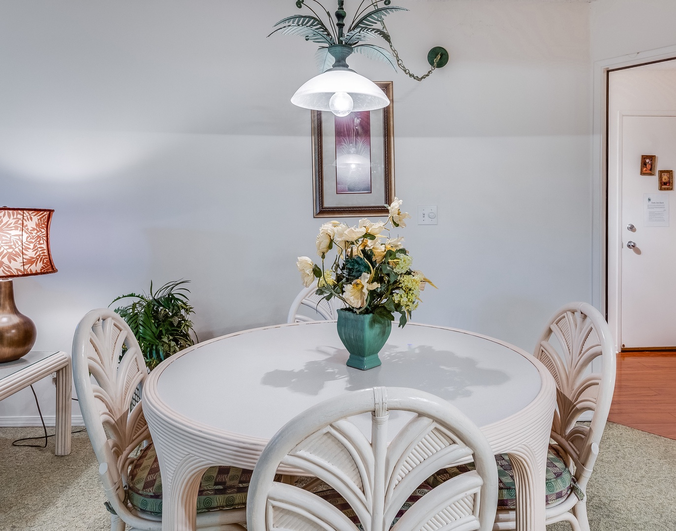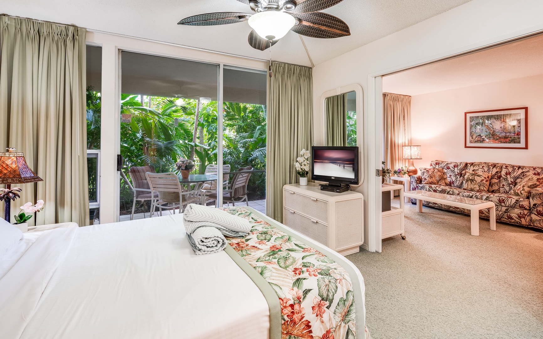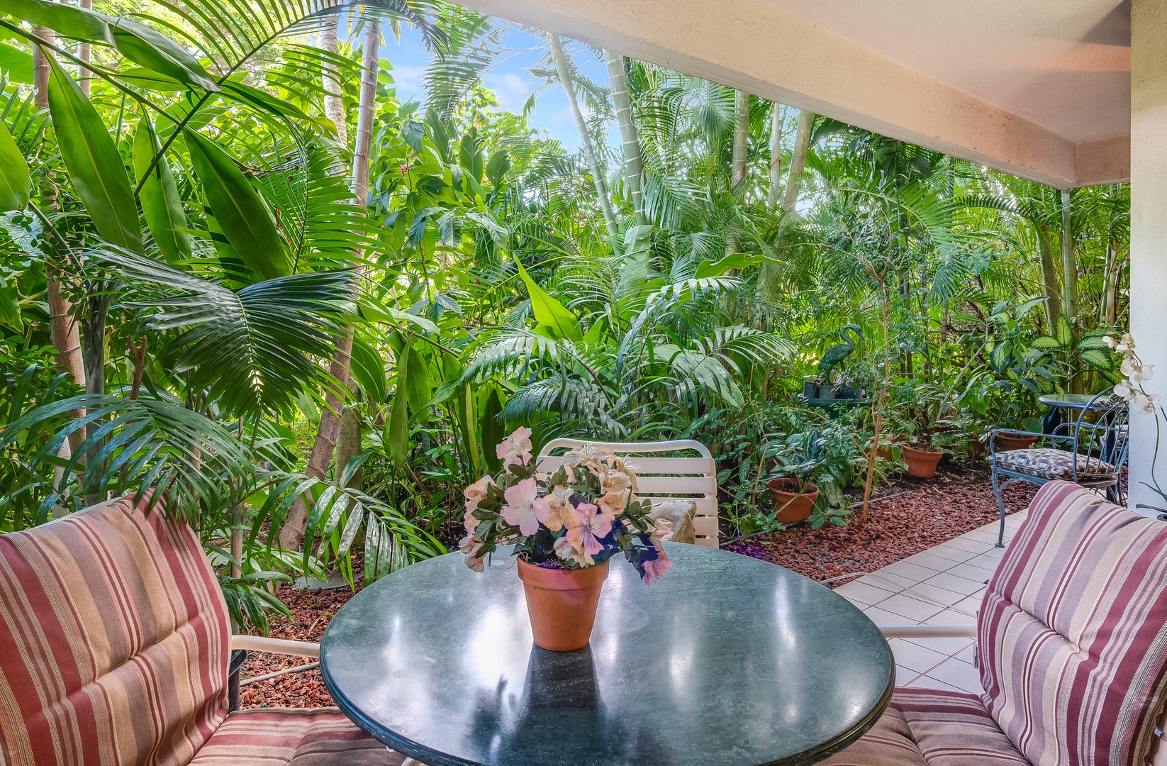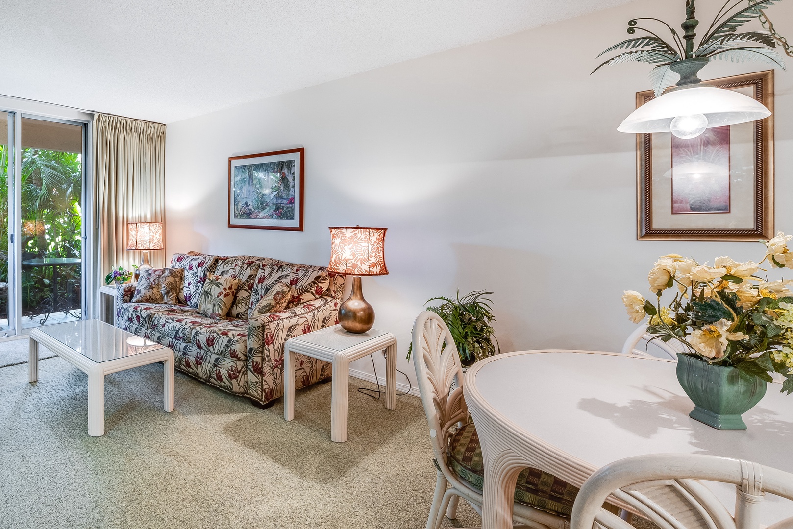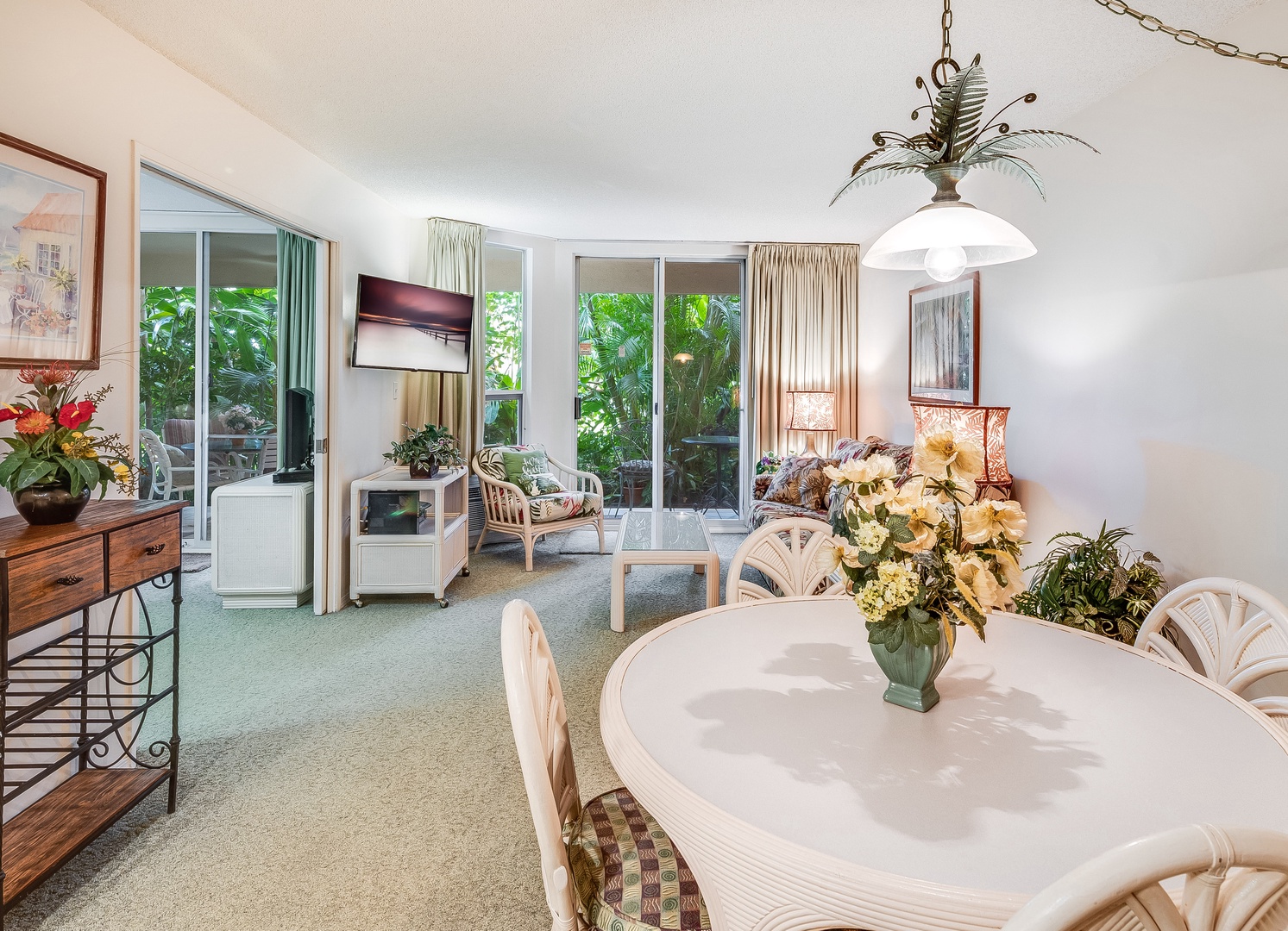 Step out to the beautifully landscaped private lanai where you’ll be surrounded by the swaying local flora. This unit offers guests plenty of shade, and patio furniture for guests to enjoy their beverages or meals outside.