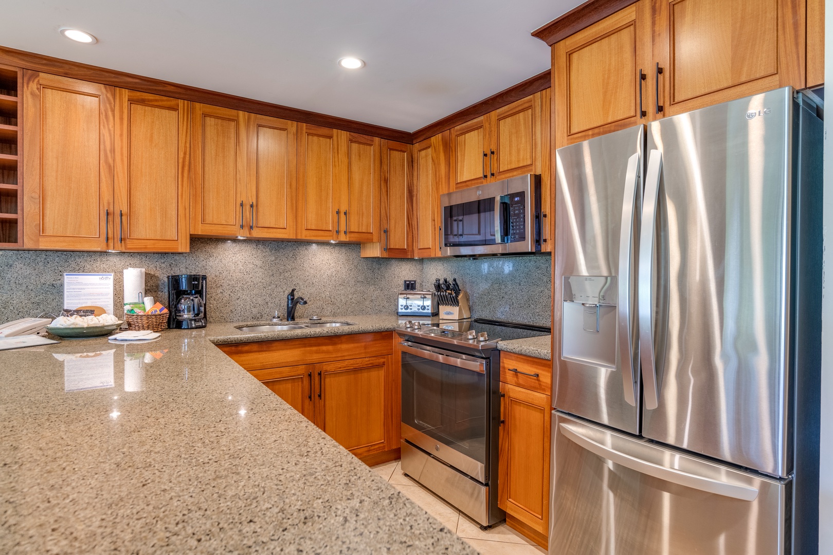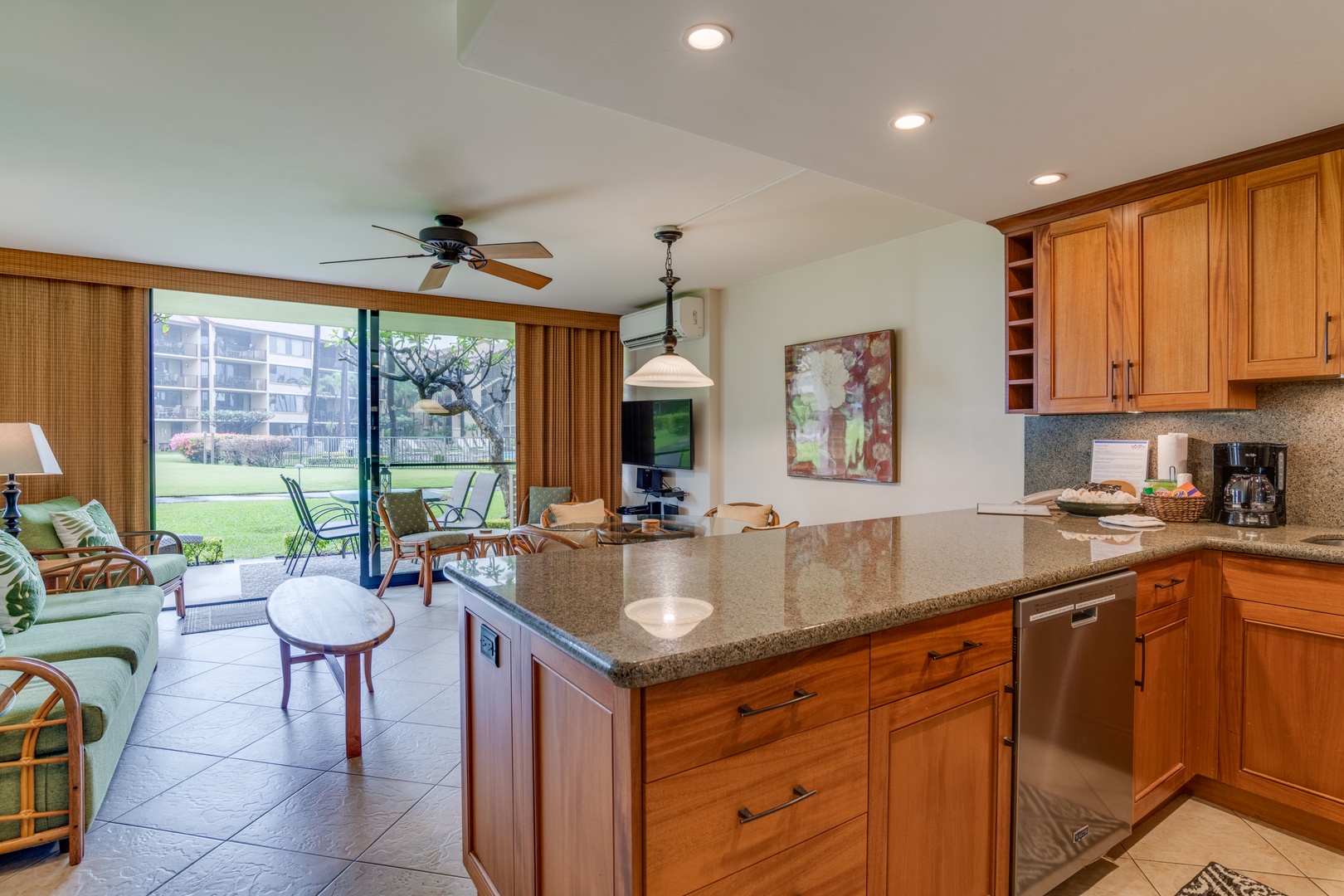Upon entry, cool tile floors welcome you and run throughout the entire condo. Everyone will be ready to visit the local farmers' markets to select local favorites to prepare in their kitchen decorated with African mahogany cabinetry, granite countertops (a long island), and brand new stainless-steel appliances, including a dishwasher, stove/oven, microwave, toaster, and a full-fridge. Sample your favorite local coffee blends prepared in your coffee pot as you enjoy breakfast on your lanai.