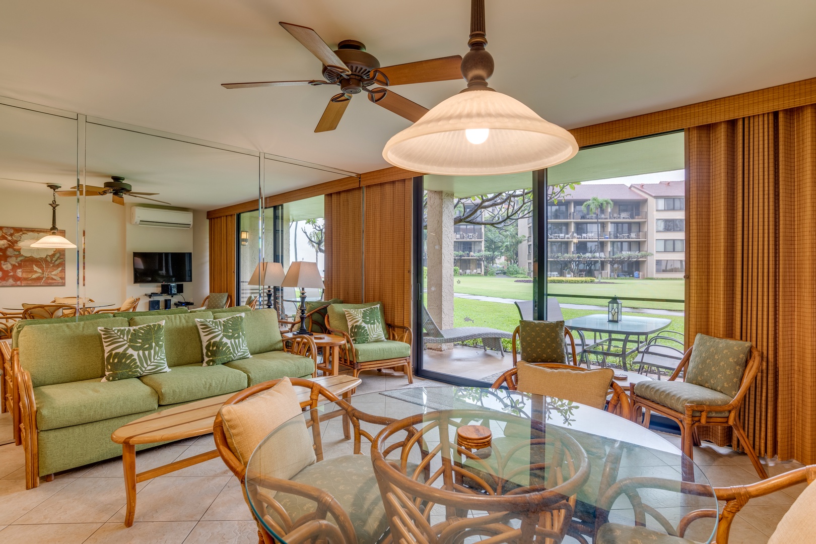 The lanai (balcony) is a great place to begin planning your day of adventure and has seating for four guests. Sit back and relax in the lounger that faces the ocean. Next to the lanai is the living room which has plenty of seating for everyone to pick their space on recently upholstered furniture. There is a four-person dining room table. In the living room is a plush sofa in front of a unique surfboard-inspired table that faces a large flat-screen television.