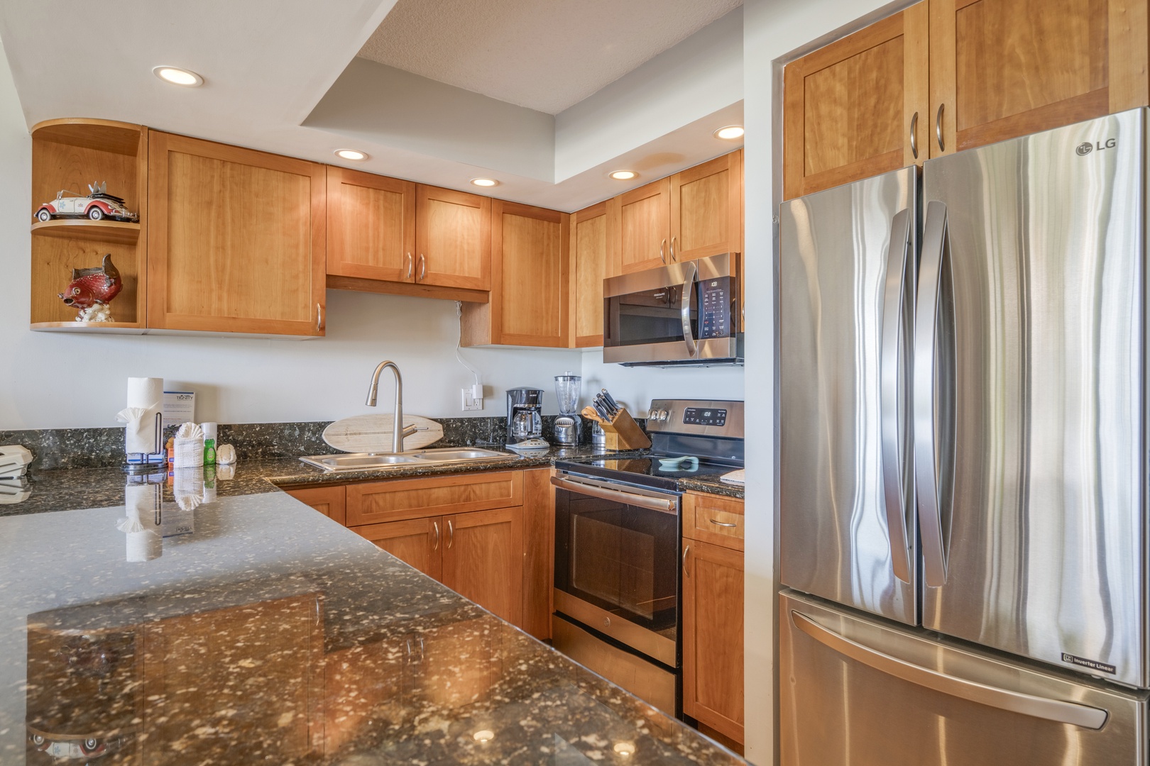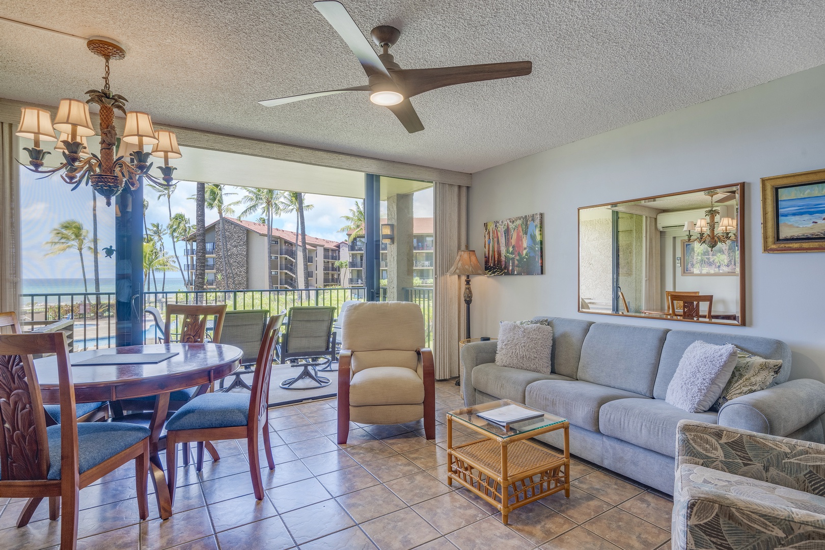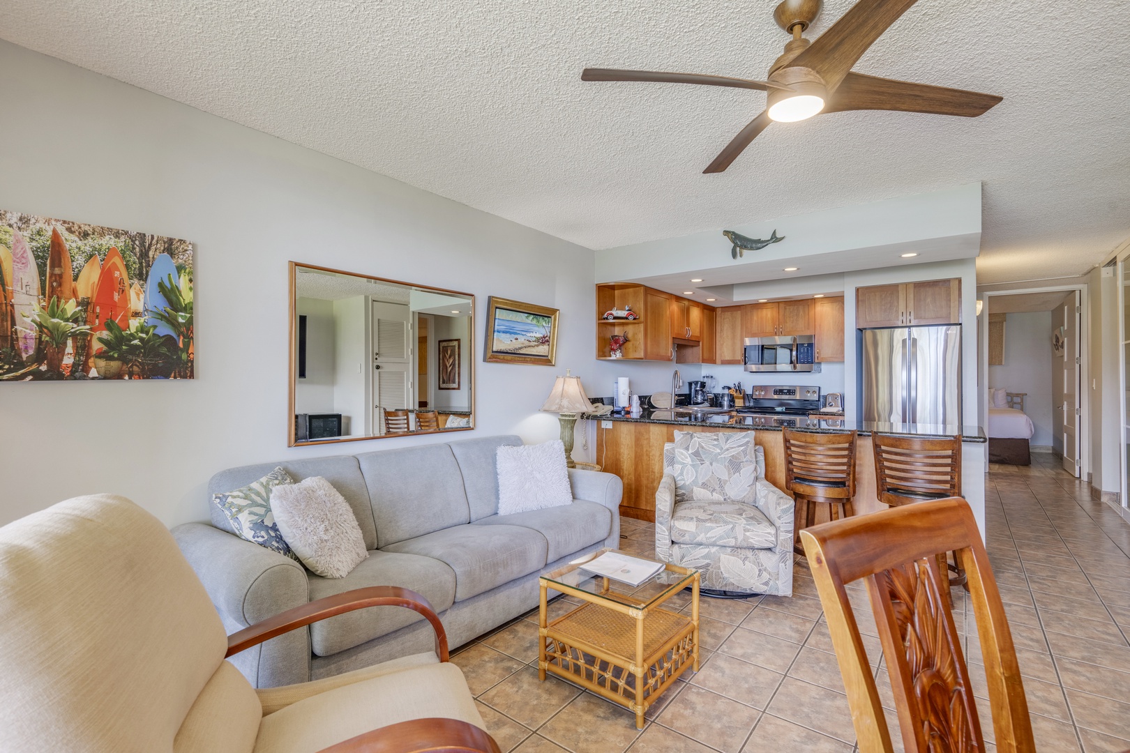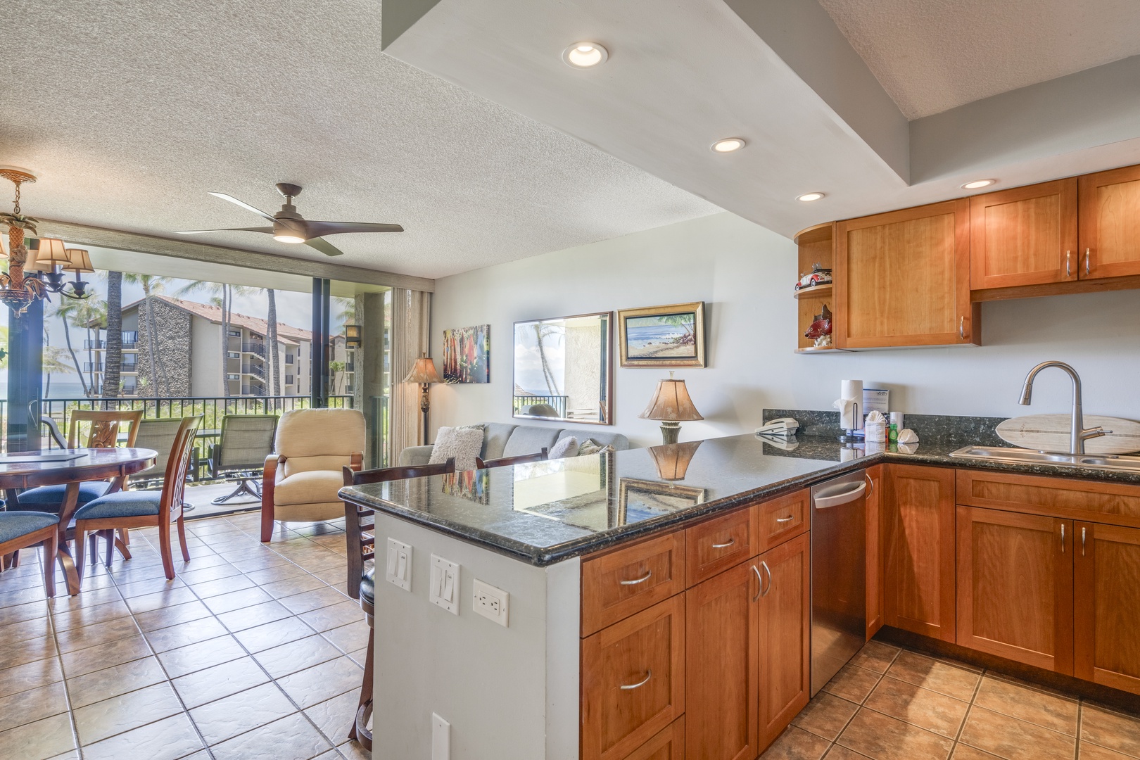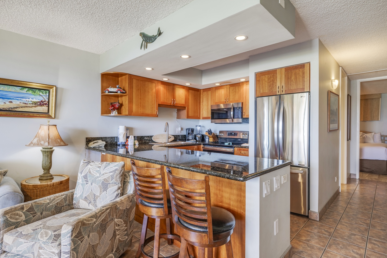 Visit our lovely 2nd floor vacation condo with wonderful ocean views in North Kaanapali. This condo features both bedrooms all on one floor. This completely remodeled unit has all brand new stainless steel appliances, a wine fridge, floor to ceiling lanai doors, a new air conditioning system and new mattresses for the queen beds and twin bed. Upgrades as of May 2021 include a new Italian sofa bed, a new 65 inch TV in the living room and a new microwave over the stove to replace the counter top model. The guest bathroom features a stall shower, no tub. Condo features a full size washer and dryer. Resort features 2 pools, shuffleboard, tennis courts, putting greens and plenty of gas BBQ's in the pool area to grill up the fresh catch of the day.